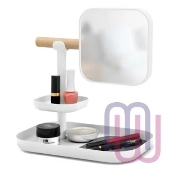 Очень удобный органайзер для косметики и аксессуаров. Оснащен съемным зеркалом с ручкой из натурального дерева. Одна сторона зеркала стандартная, вторая — косметическое зеркало, увеличивающее в 5 раз. Зеркало можно легко перенести ближе к источнику света, когда это понадобится. Две полочки разных размеров выполнены из металла. Небольшой резиновый коврик плотно зафиксирует мелкие предметы, например помаду или тушь для ресниц.