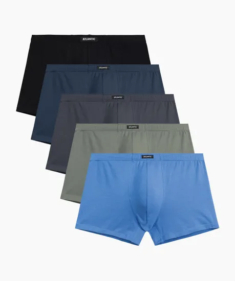 Набор из 5 шт. мужских трусов-шорт Atlantic светло-голубого, графитового, черного, светлого хаки и индиго цвета. Мужские однотонные трусы-шорты 5SMH-002 от польского бренда Atlantic на каждый день: превосходно подойдут абсолютно любому мужчине как для повседневной носки, так и для активного занятия спортом (например, бега или фитнеса). Спортивный крой этой модели гарантирует идеальную посадку по фигуре и максимальный комфорт. Скрытая туннельная резинка не давит и не натирает при носке, а также обеспечивает контакт только с натуральным материалом. Облегающие мужские трусы шорты имеют среднюю линию талии, штанины стандартной длины и профилированный гульфик, поэтому могут подойти к любому типу одежды. В составе используется мягкий, приятный на ощупь хлопок в сочетании с эластаном. Трикотажное хлопковое полотно является прочным материалом, устойчивым к высоким температурам и растяжению, благодаря чему нижнее белье надолго сохраняет свой внешний вид и потребительские свойства. В упаковке представлено пять трусов шорт в различных вариантах расцветок - от строгого классического до яркого молодежного. Нижнее белье Атлантик будет превосходным подарком для мужчин всех возрастов: молодым парням и подросткам подойдут модели нижнего белья в яркой цветовой гамме и с паттерном или рисунком, более взрослым мужчинам - нижнее белье в сдержанных или строгих цветах, хотя иногда можно нарушить правила и поэкспериментировать.