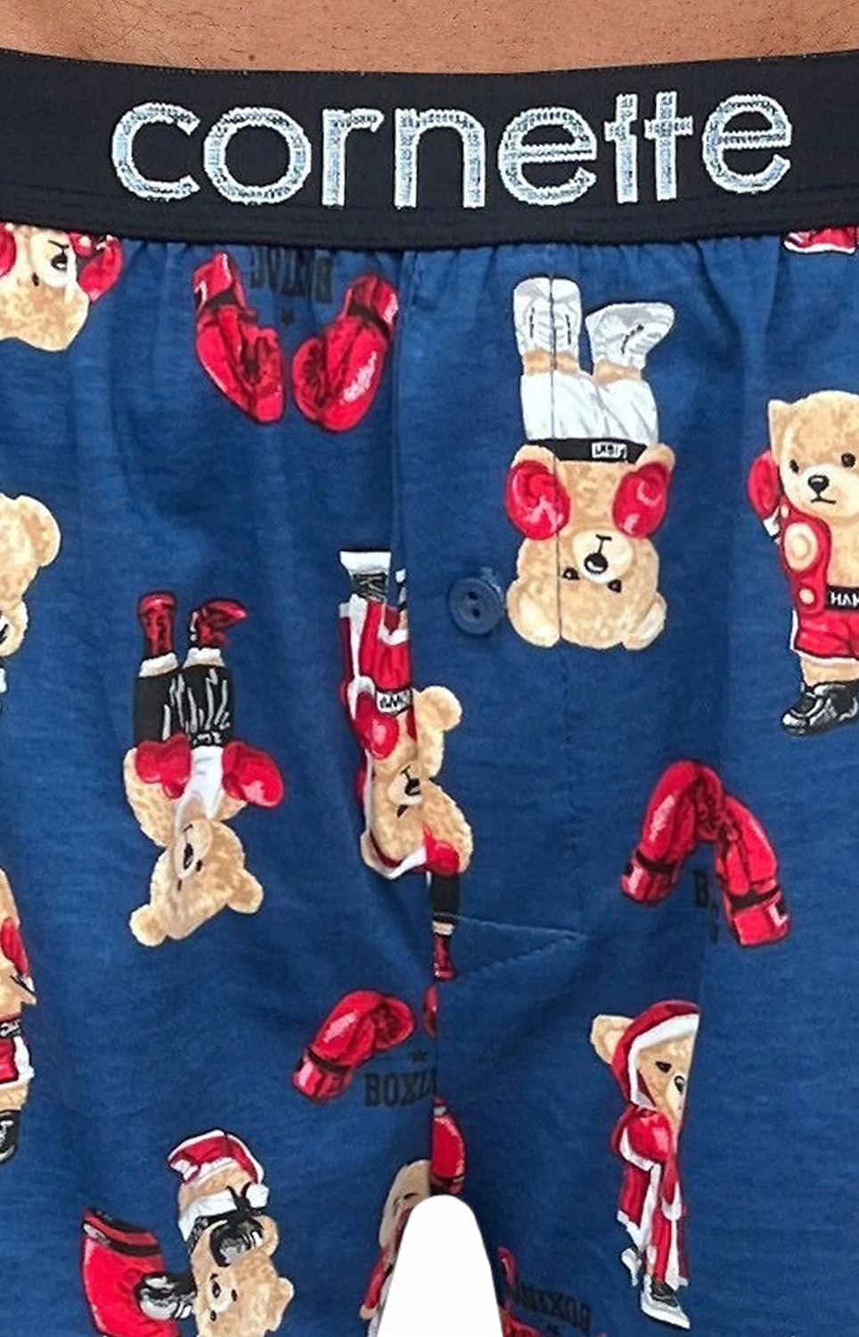 Классические свободные боксерки выполнены из 100% мягкого хлопкового полотна, обогащенного забавным рисунком (мишка боксёр). Трусы на широкой жаккардовой резинке с логотипом бренда. На гульфике крохотная пуговичка. Материал выдерживает многократные стирки, не меняя цвета и не растягиваясь. Имеют отдельную упаковку в виде картонной коробки. Состав: 100% хлопок Произведено в Польше.