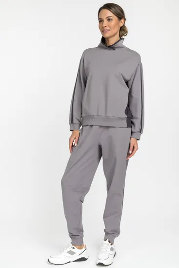 Стильные брюки из хлопкового футера. Свободный силуэт, контрастные лампасы, эластичный пояс, карманы по бокам и широкий манжет по низу брюк.