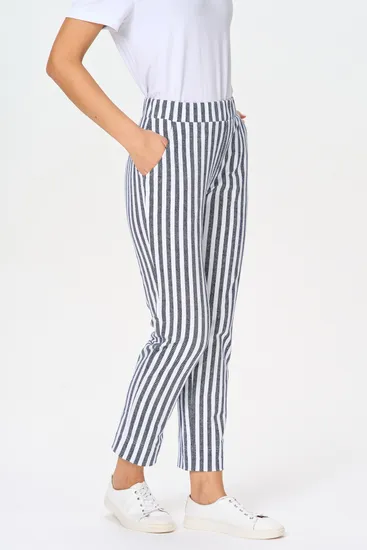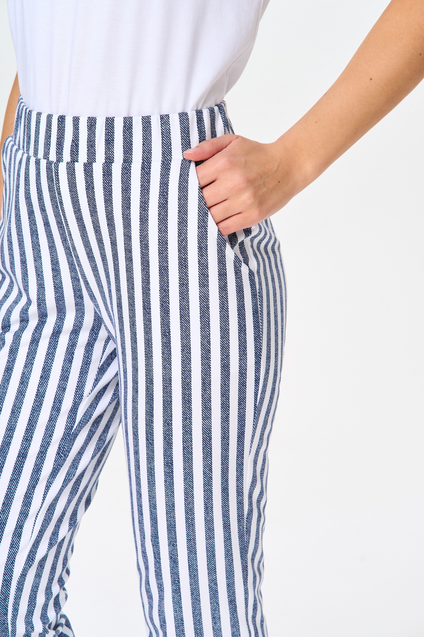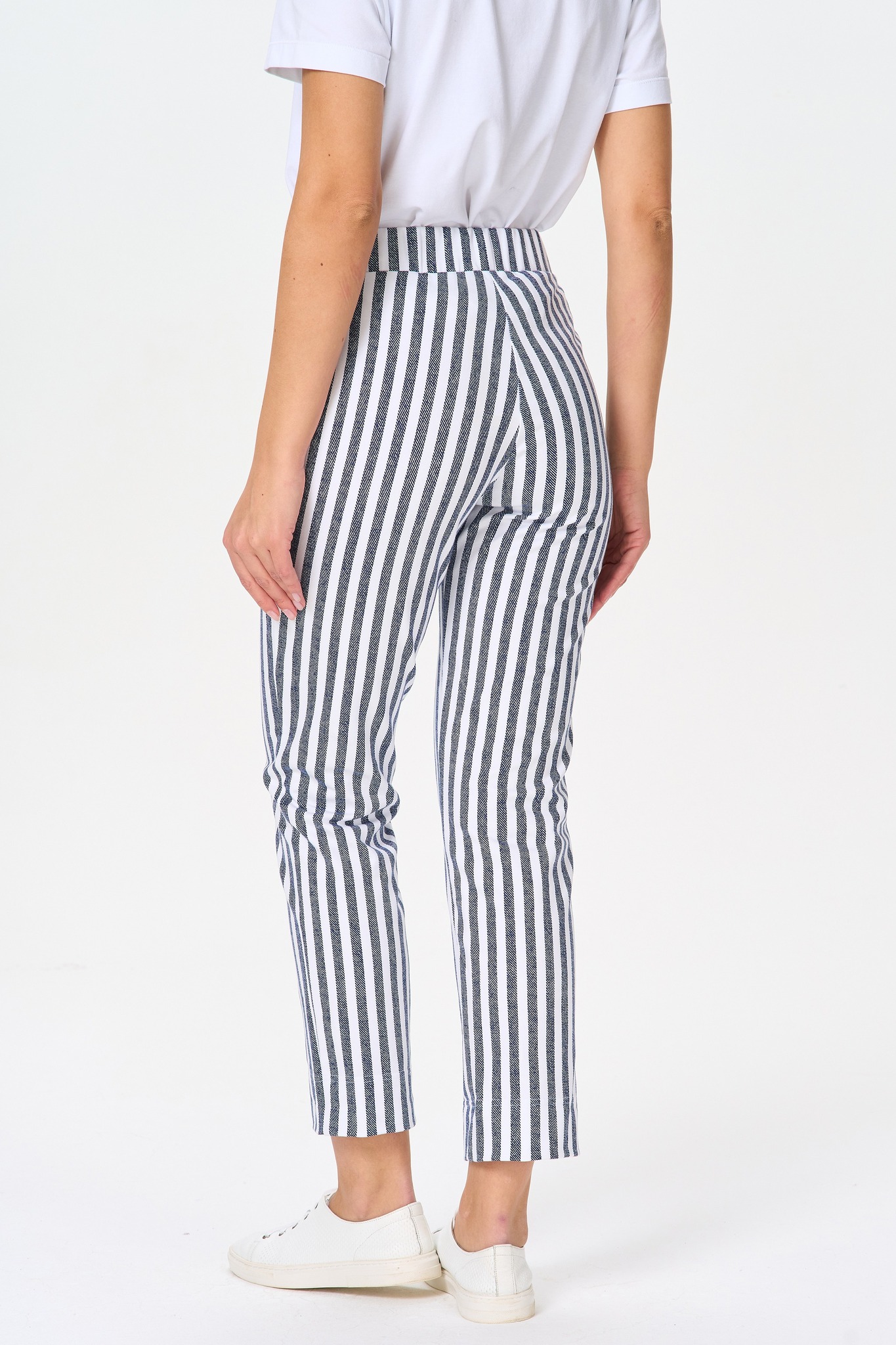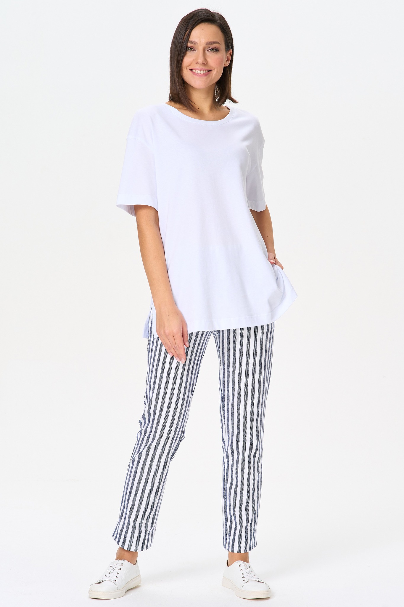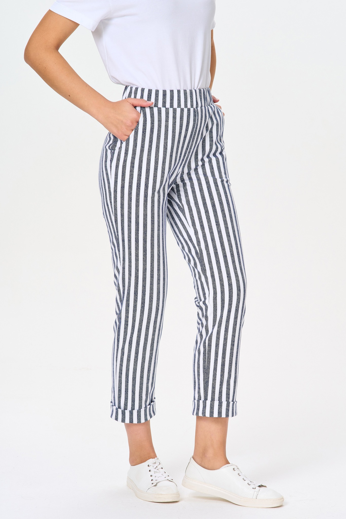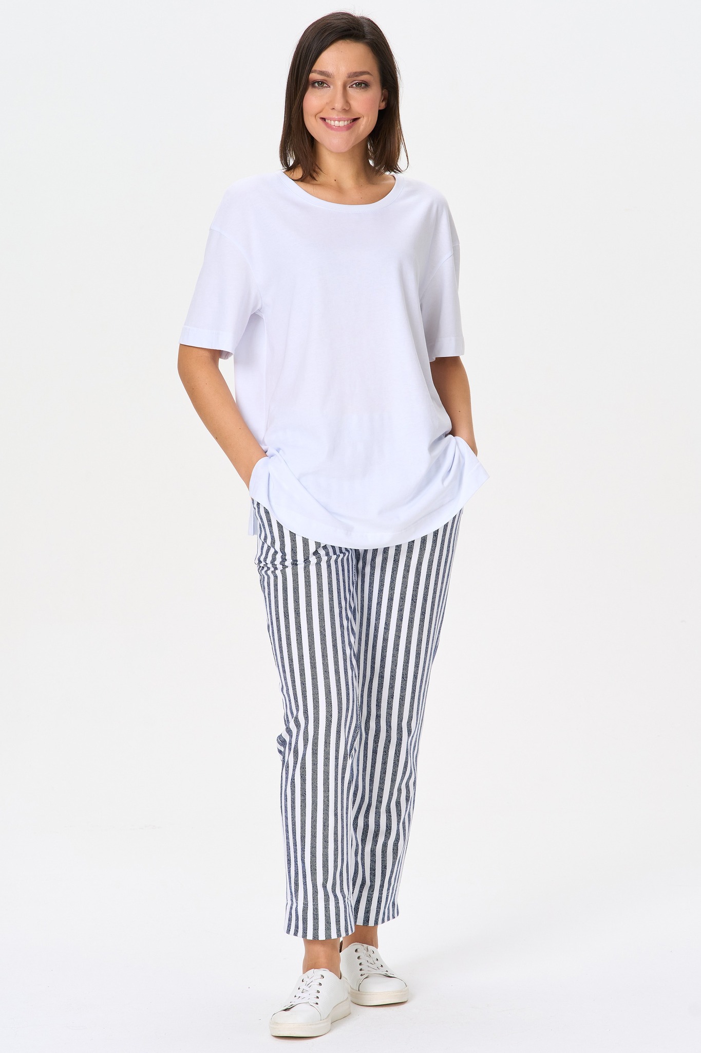 Прямые брюки с карманами, из хлопкового футера. Пояс с эластичной лентой внутри. Длина брюк регулируется подворотом. Рост модели на фото 170 Цвет: синий Состав: 92% хлопок, 8% эластан Тип полотна: Футер