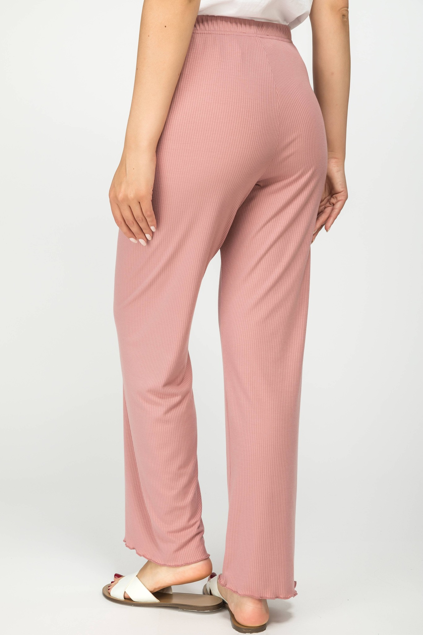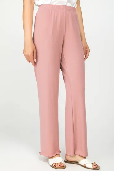 Широкие струящиеся брюки-Палаццо из вискозного трикотажного полотна рибана. Цельнокроенный пояс с эластичной тесьмой внутри. Рост модели на фото 170 Цвет: розовый темный Состав: 62% вискоза, 30% полиэстер, 8% эластан