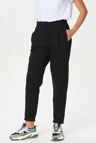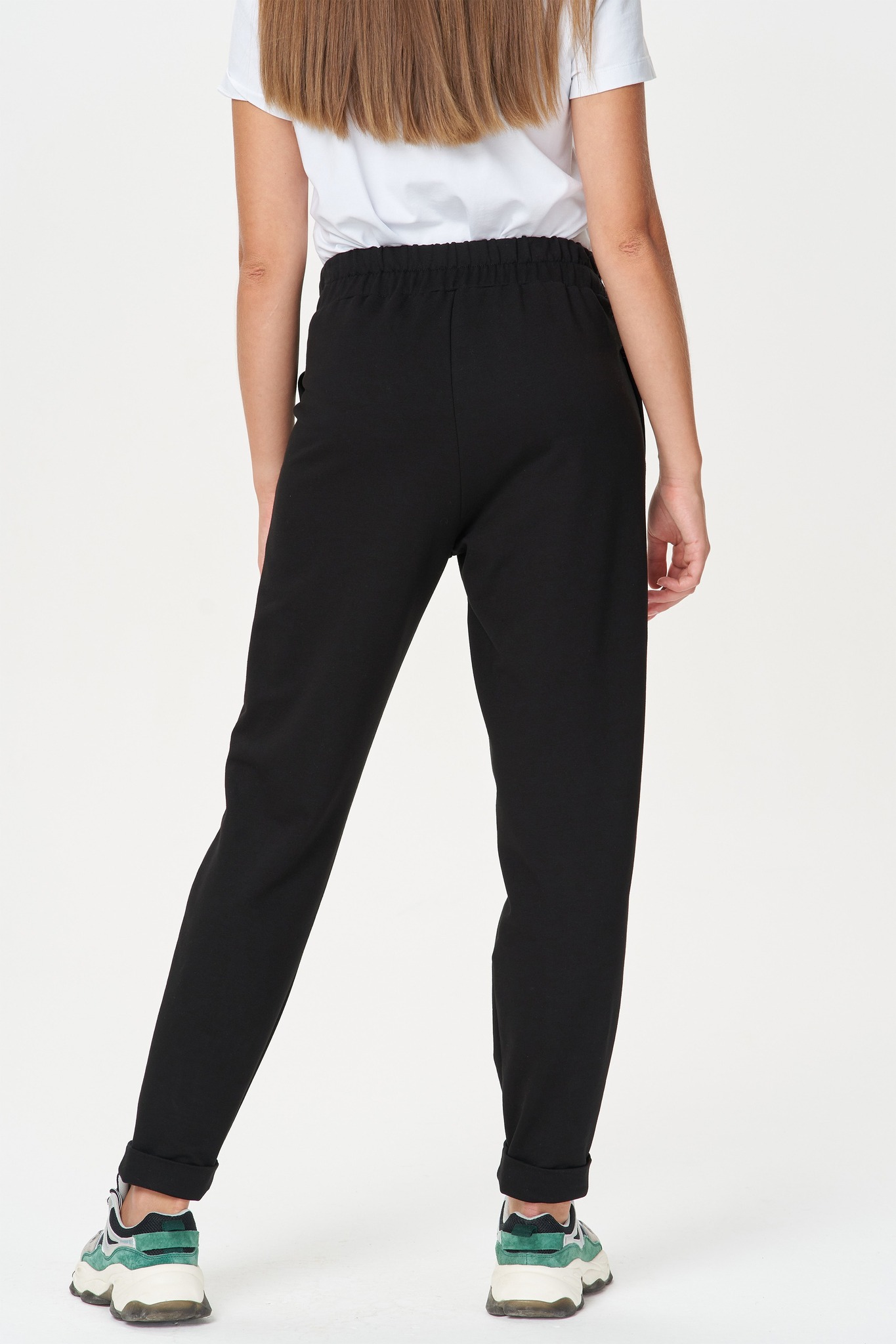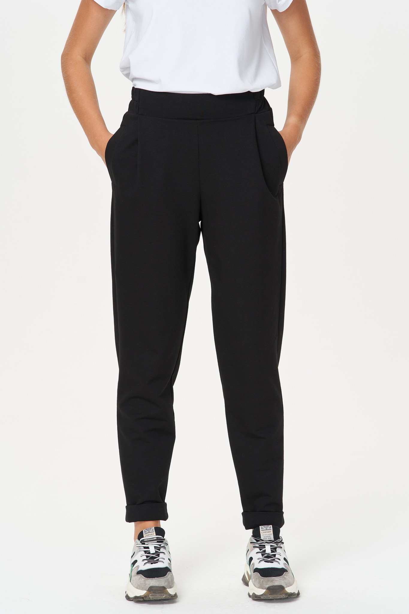 Свободные брюки со складками на поясе. Выполнены из хлопкового трикотажного полотна-футер. Модель имеет пояс с эластичной резинкой внутри, два боковых кармана. Низ брюк с широкой подгибкой, которая позволяет регулировать длину. Рост модели на фото 177 Цвет: чёрный Состав: 80% хлопок, 14% полиэстер, 6% эластан