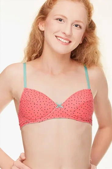 Бюстгальтер для девушек, выполненный из хлопка с эластаном, с контрастными регулируемыми бретелями и поролоновыми чашками без косточек. Внешняя часть и пояс декорированы рисунком горошек, на соединителе аппликация в виде бантика с подвеской маленький ключик.
