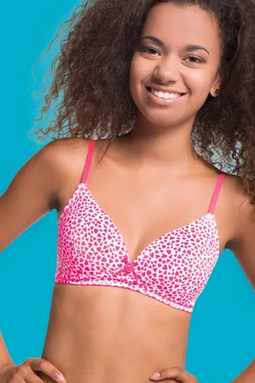Бюстгальтер для девушек, выполненный из мягкого хлопка с эластаном, с регулируемыми бретелями и поролоновыми чашечками, рисунок сердечки, аппликация в виде бантика и розочки на соединителе.