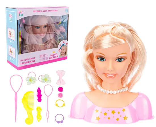 В комплекте помимо манекена расческа, 2 петли-стайлера для волос и большой выбор заколок и резинок для волос.