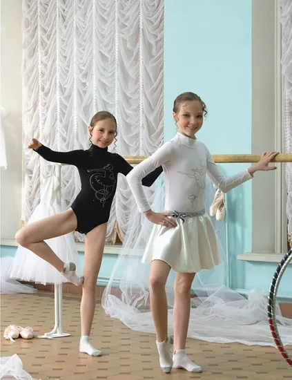 Боди для девочек Arina Ballerina SGB 200804. Модный спортивный купальник-боди для девочек. Модель с длинным рукавом, воротничком-стойкой, украшенная принтом по передней детали изделия и логотипом на спинке.