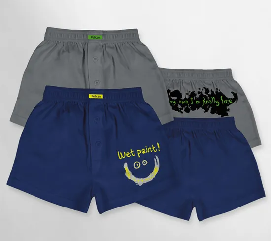 Боксеры изготовлены из 100% хлопка с мягкой эластичной резинкой и двумя пуговичками. В коробке пара трусов, одного размера, разного цвета, одни боксеры с принтом сзади, вторые украшены надписью Wet paint и веселым смайликом. Натуральный хлопок, из которого изготовлены боксеры, легкий и приятный к телу материал, выдерживает многократные стирки, не меняя цвета и не растягиваясь. Такие трусы с удовольствием будут носить как совсем маленькие мальчики, так и дети старшего возраста. Состав: 100% хлопок.