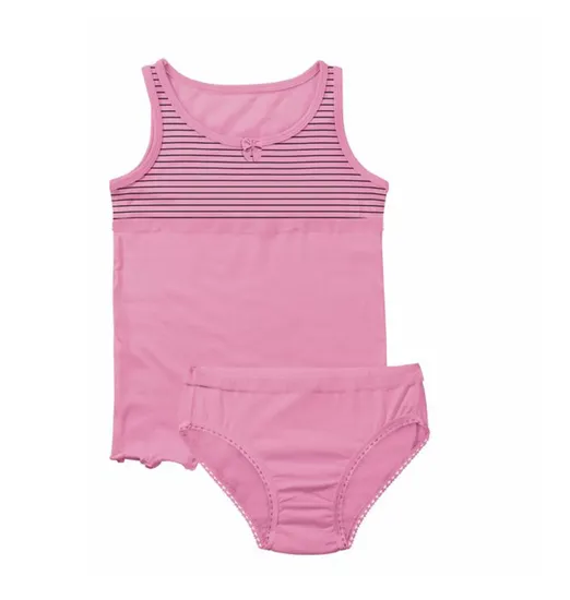 Нежный и приятный для тела комплект для девочек состоит из маечки и трусиков. Маечка в данном наборе детской одежды на широких лямочках, однотонная в полоску. Удобные однотонные трусики. Изделия выполнены из высококачественного гипоалергенного хлопка. Предлагаемый Вам комплект неприхотлив в уходе и надолго сохраняет цвет и форму даже после многочисленных стирок