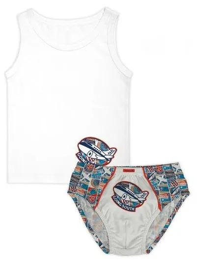 Мягкий и приятный на ощупь комплект для мальчиков состоит из маечки и трусиков. Такой комплект впечатлит любого мальчугана. Изделие выполнено из натурального материала — хлопка высочайшего качества. Неприхотливый в уходе комплект от компании Pelican, надолго сохранит яркие цвета даже после многочисленных стирок.