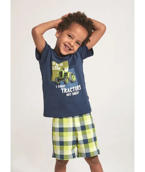 Пижама выполнена из высококачественного натурального хлопка, состоит из синей футболки и прямых шорт в клетку. Футболка с коротким рукавом, с округлым вырезом горловины, шорты на мягкой резинке в поясе. В качестве декора - футболку украшает яркий принт с надписями. Пижама очень стильная и комфортная, можно использовать как одежду для дома.
