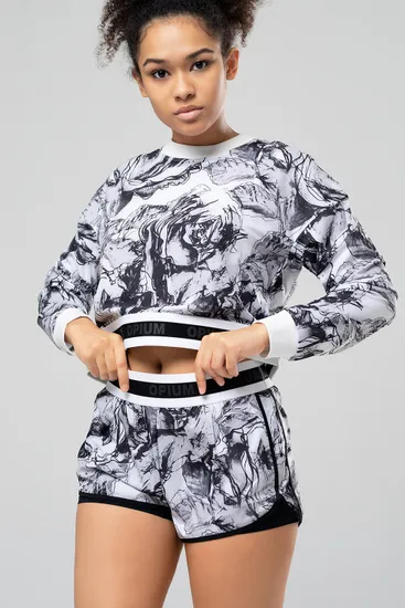 Женский спортивный кроп-топ с рукавами. Выполнен из тончайшей микрофибры с модным абстрактным принтом. Обтачка горловины и манжеты – из эластичного хлопка. Снизу – брендированная резинка. Стильная и модная вещь в вашем спортивном гардеробе.