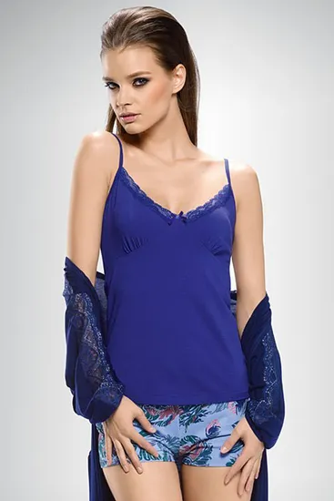 Пижама женская из трикотажного хлопка. В комплекте однотонная майка с тонкими бретельками и шорты с красивым цветочным рисунком, комфортный пояс регулируется шнурком в кулиске. Состав: 93% хлопок, 7% эластан.