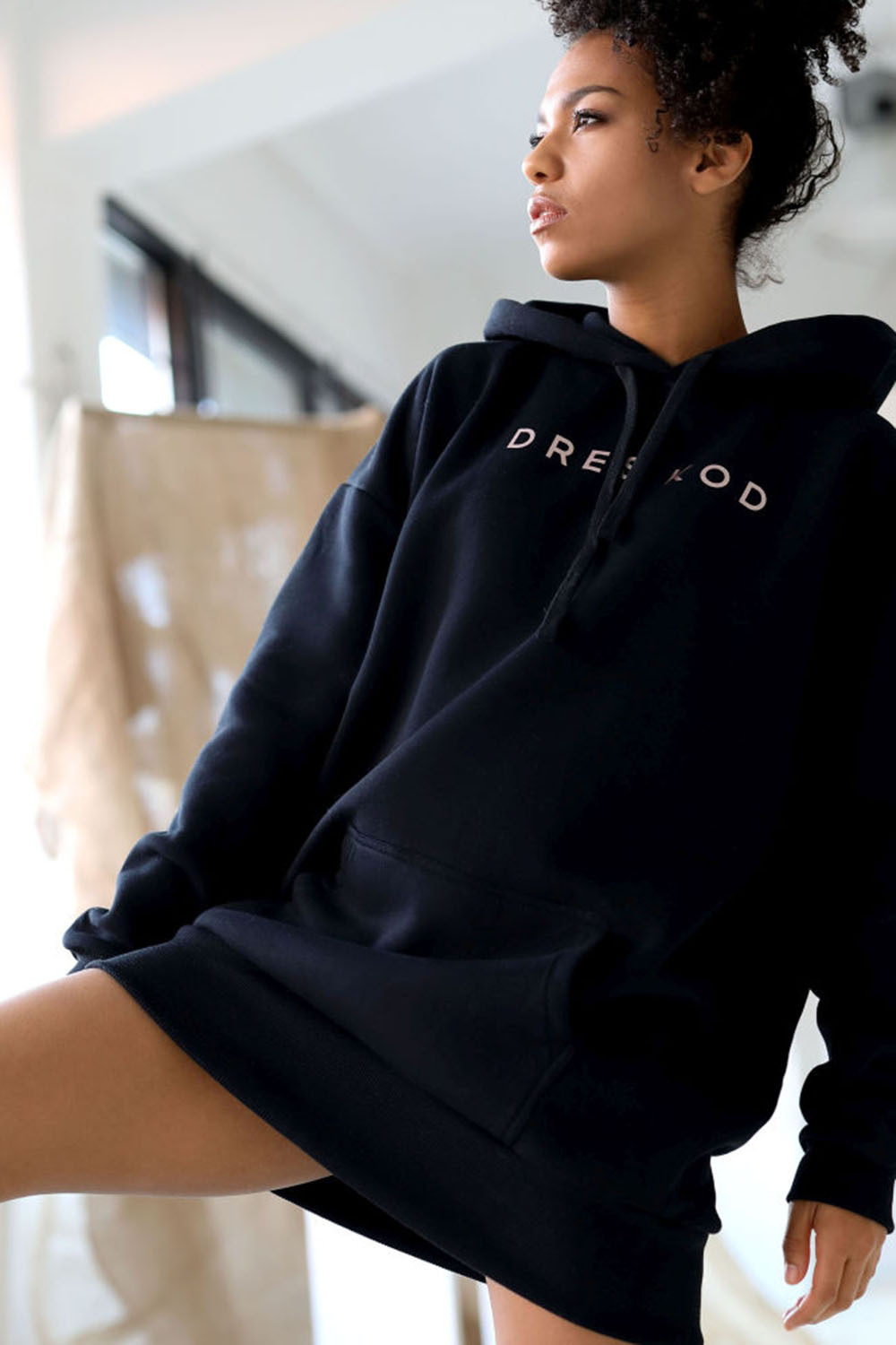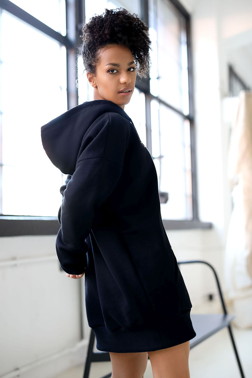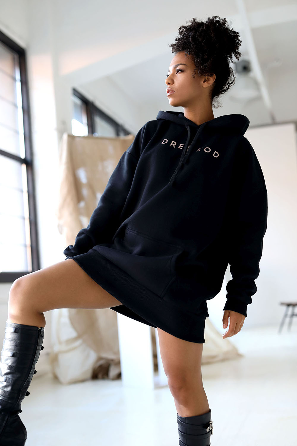 Черное платье-худи oversize DK24 02 с капюшоном, выполнено из плотной ткани с начесом. Спереди накладной карман и голографический логотип. Рукава и нижняя кромка отделаны трикотажной резинкой.