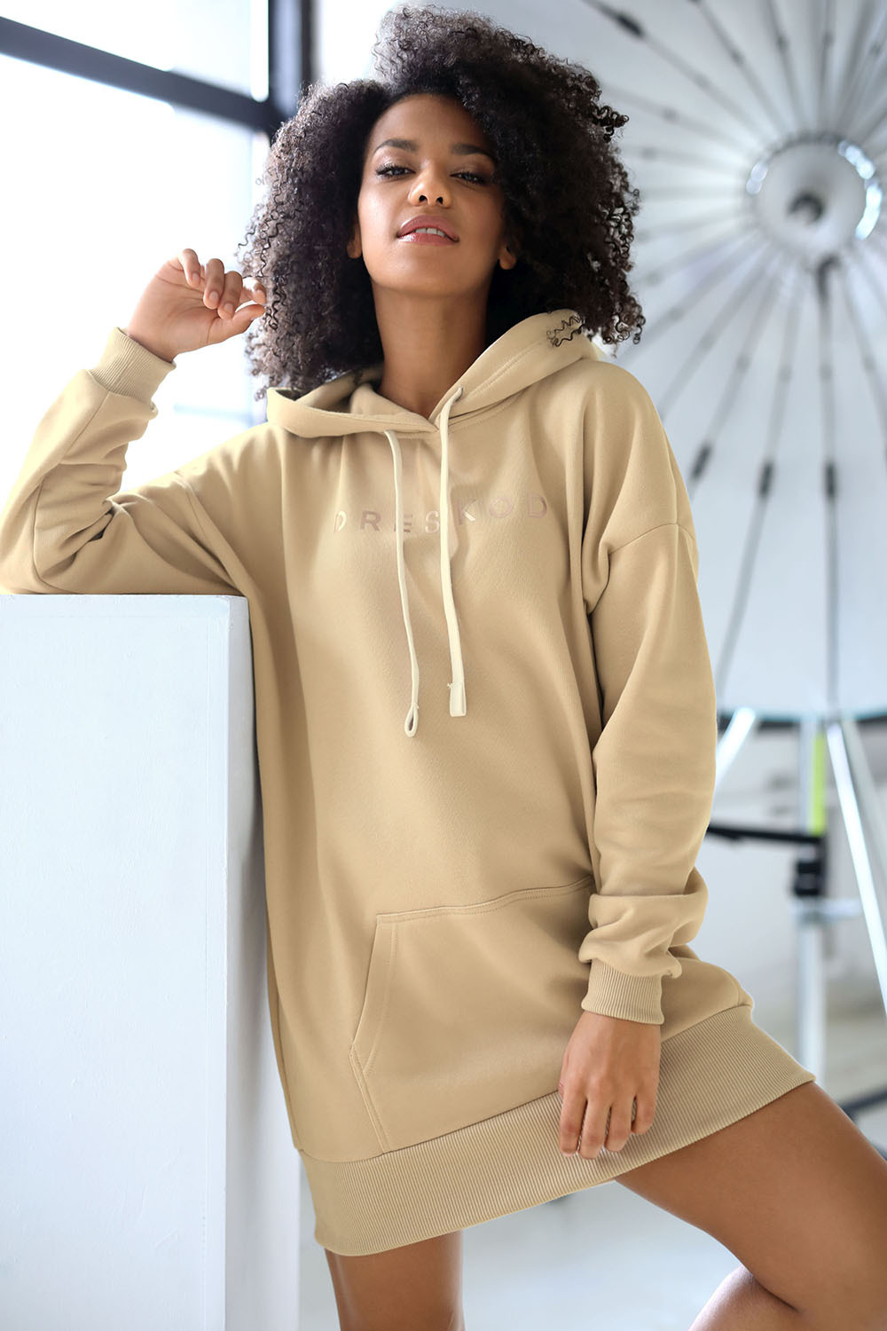 Бежевое платье-худи oversize DK24 06 с капюшоном, выполнено из плотной ткани с начесом. Спереди накладной карман и голографический логотип. Рукава и нижняя кромка отделаны трикотажной резинкой.