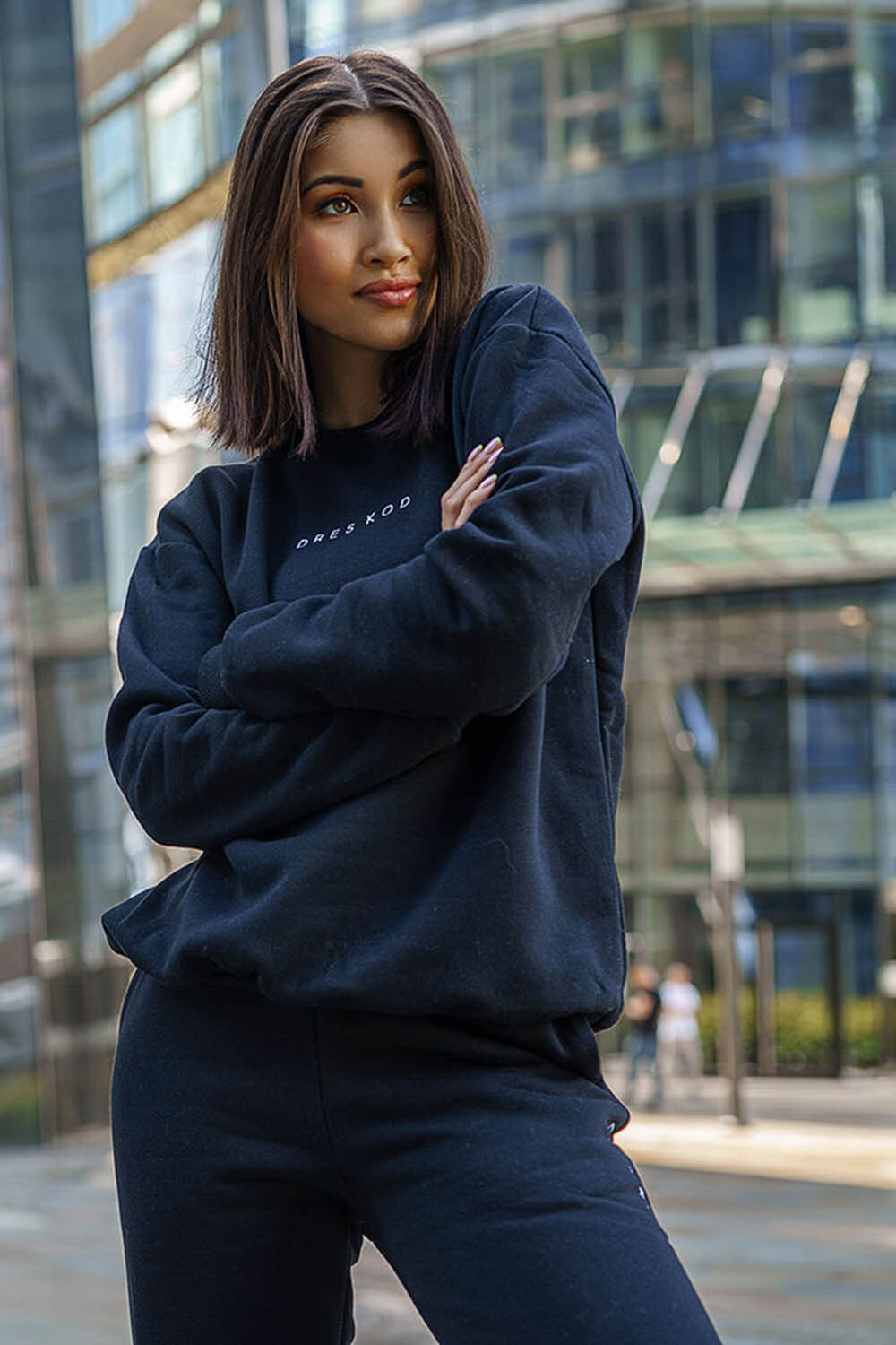 Свитшот oversize DK01 02 черного цвета с белым фирменным логотипом спереди. Вырез горловины, рукава и нижняя кромка отделаны трикотажной резинкой.