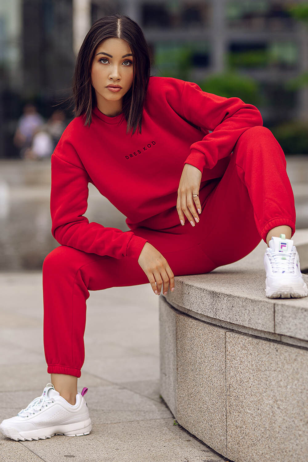 Свитшот oversize DK01 07 красного цвета с фирменным логотипом спереди. Вырез горловины, рукава и нижняя кромка отделаны трикотажной резинкой.