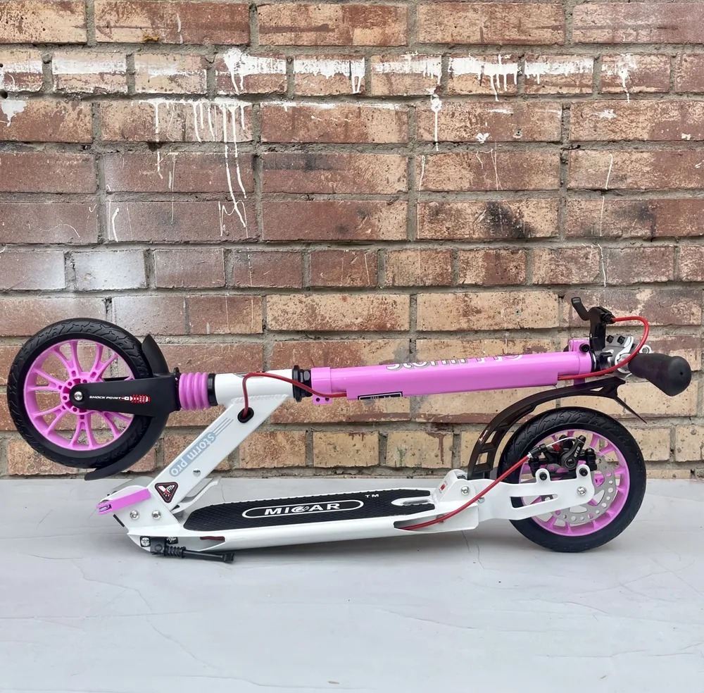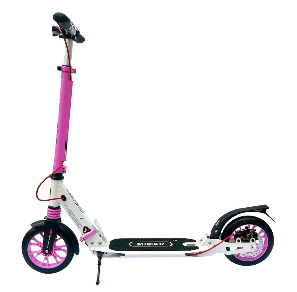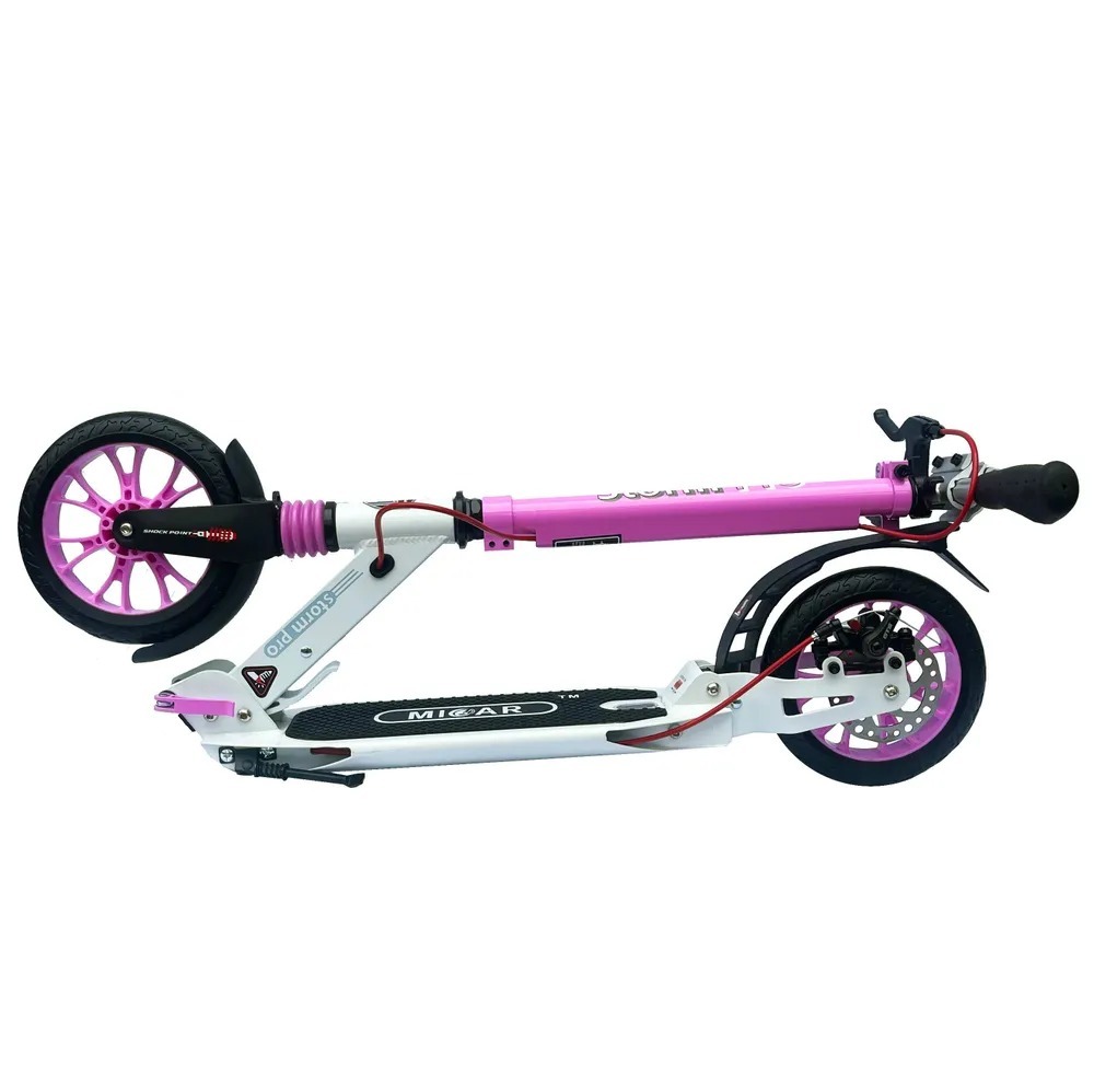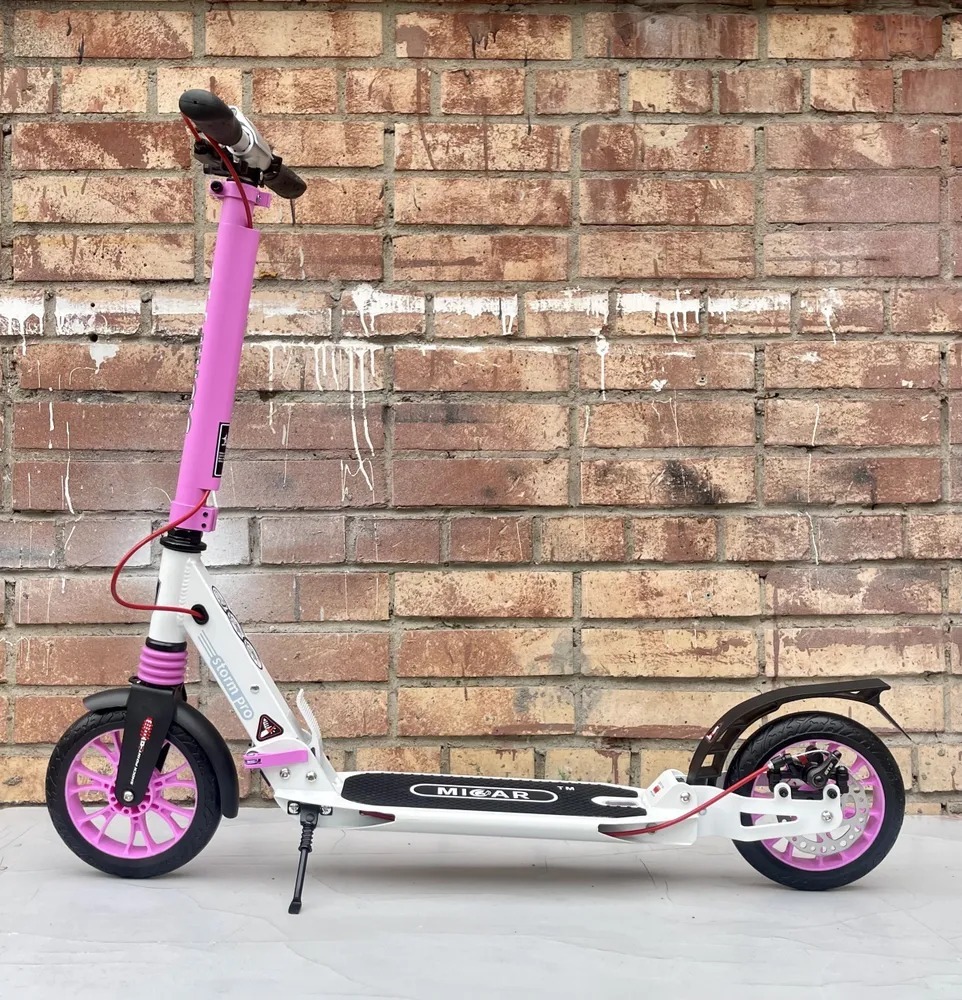 Складной самокат с двумя амортизаторами и ручным дисковым тормозом заднего колеса Micar Storm Pro 200 мм подходит как для детей в возрасте от 6-7 лет, так и для взрослых до 100 кг. Складной самокат Micar Storm Pro с большими колёсами 200 мм и двумя амортизаторами на переднем и заднем колесе сделают катание на самокате максимально комфортным. Руль самоката легко регулируется по высоте и надёжно фиксируется благодаря специальному зажиму на ручке самоката. Scooter Micar Storm Pro 200 мм легкий и поэтому идеально подходит для детей младшего возраста, поскольку незначительный вес позволяет переносить его через тротуар и ступени без посторонней помощи. Городской самокат оснащён ручным дисковым тормозом заднего колеса, а также удобным педальным тормозом-крылом, расположенным над задним колесом самоката. Вы и ваш ребёнок будет наслаждаться комфортным катанием на новом самокате с большими колёсами Micar Storm Pro 200 мм. В комплекте идёт ремень для переноски самоката.