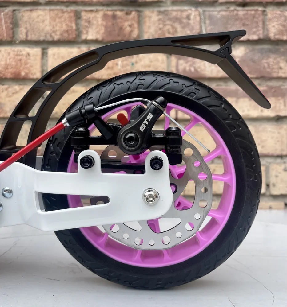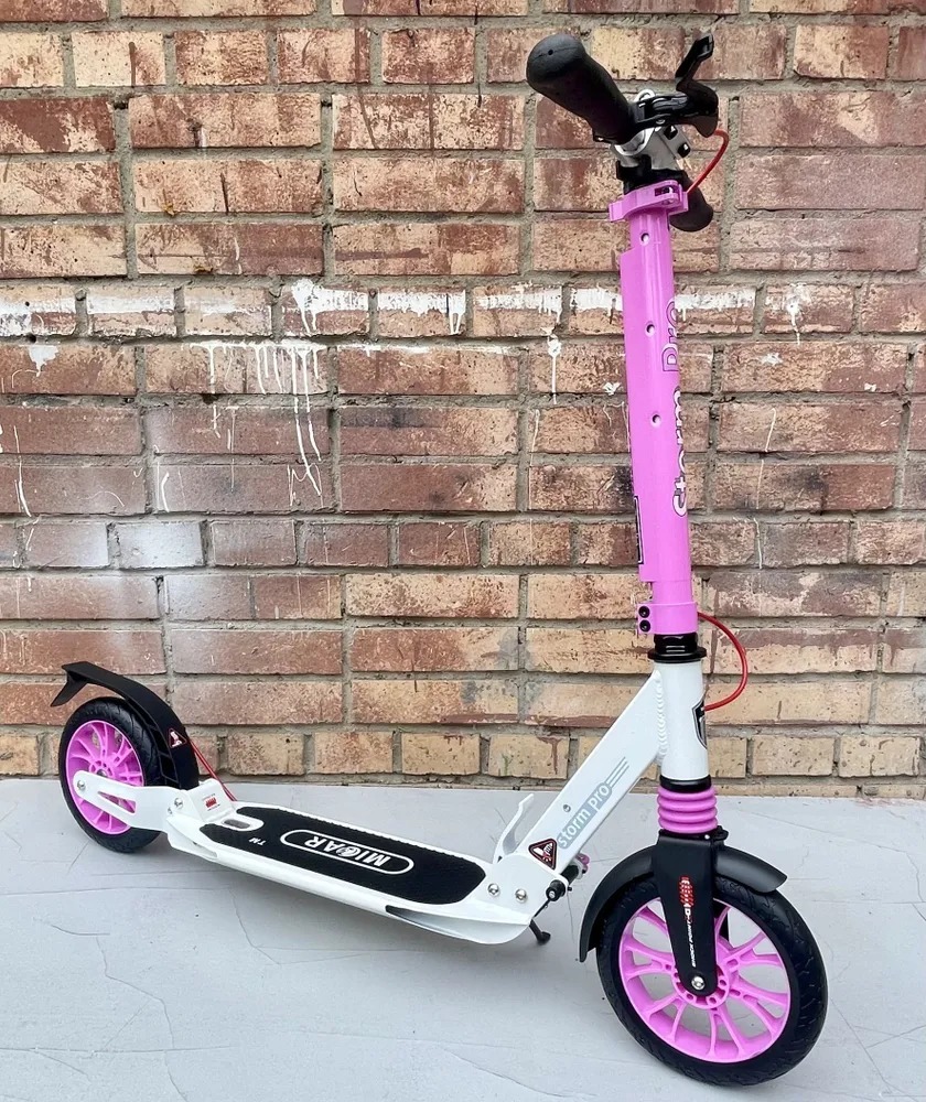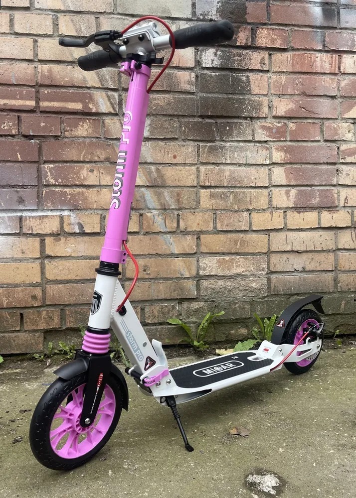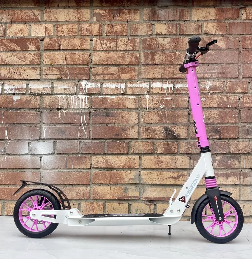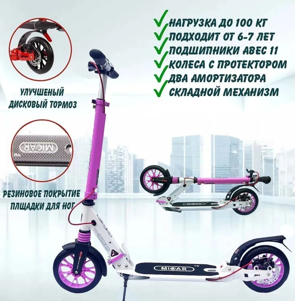 Складной самокат с двумя амортизаторами и ручным дисковым тормозом заднего колеса Micar Storm Pro 200 мм подходит как для детей в возрасте от 6-7 лет, так и для взрослых до 100 кг. Складной самокат Micar Storm Pro с большими колёсами 200 мм и двумя амортизаторами на переднем и заднем колесе сделают катание на самокате максимально комфортным. Руль самоката легко регулируется по высоте и надёжно фиксируется благодаря специальному зажиму на ручке самоката. Scooter Micar Storm Pro 200 мм легкий и поэтому идеально подходит для детей младшего возраста, поскольку незначительный вес позволяет переносить его через тротуар и ступени без посторонней помощи. Городской самокат оснащён ручным дисковым тормозом заднего колеса, а также удобным педальным тормозом-крылом, расположенным над задним колесом самоката. Вы и ваш ребёнок будет наслаждаться комфортным катанием на новом самокате с большими колёсами Micar Storm Pro 200 мм. В комплекте идёт ремень для переноски самоката.