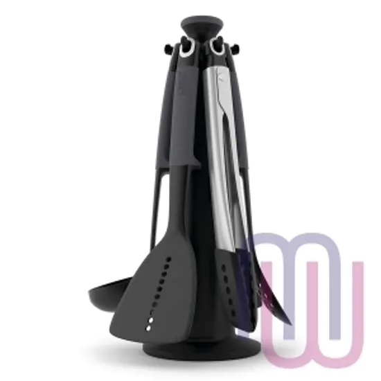 Набор из 6 кухонных инструментов с щипцами на вращающейся подставке. Входит в серию кухонных приборов Elevate™ , разработанную с целью минимизировать беспорядок во время готовки. Каждый прибор оснащен инновационной утяжеленной ручкой, благодаря которой испачканная часть инструмента всегда остается навесу и не касается рабочей поверхности. Удобная вращающаяся подставка обеспечит легкий доступ к нужному прибору. В набор входит: поварская ложка, гибкая лопатка, шумовка, щипцы, лопатка-шумовка, половник, подставка-каручель. Рабочая поверхность инструментов выдерживает до 200° С, эргономичные термостойкие ручки из силикона - до 270° С. Силиконовые наконечники щипцов также выдерживают нагревание до 270°C. Подходят для любого типа посуды. Инструменты можно мыть в посудомоечной машине, подставку - протирать влажной тканью.