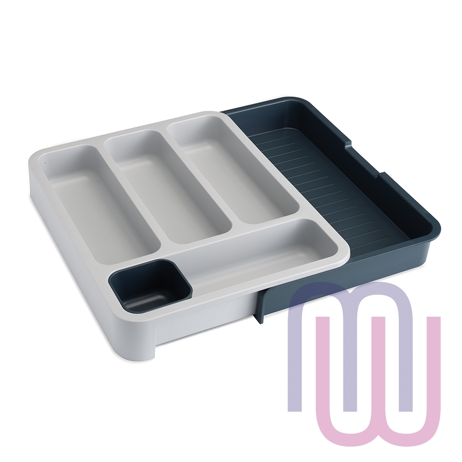 Практичное решение для размещения столовых приборов в идеальном порядке. Две съёмные части лотка регулируются под кухонные ящики самых разных размеров и надёжно закрепляются в нужном положении. Органайзер состоит из четырёх глубоких ячеек для ложек и вилок, вместительного отделения для ножей и крупных кухонных инструментов, а также небольшого съёмного контейнера для различных мелочей. Подходит для кухонных ящиков шириной от 29 см. до 48 см.Мыть рекомендуется только вручную.