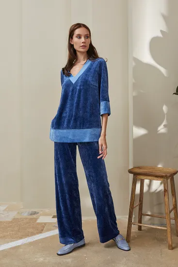 Топ темно-синего цвета с V-образным вырезом станет не только удобным, но красивым дополнением домашнего образа. Топ классической посадки длиной до середины бедра, изящные рукава 3/4.