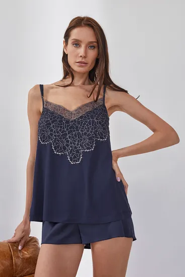 Изящный топ на тонких бретелях темно-синего цвета. Особой деталью данной модели является V- образный вырез в зоне декольте и на спинке, который декорирован прозрачным и нежным кружевом. Тонкие регулируемые бретели придают образу соблазнительности и элегантности. Кружево по линии декольте добавляет чувственности в пижамный образ и позволяет ощущать себя привлекательной.