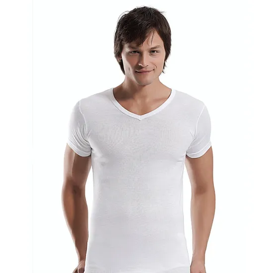 Тонкая мужская футболка прилегающего силуэта. Модный фасон с характерными короткими рукавами и большим вырезом, оформленным плотной обработкой, делают данную футболку отличным дополнением модного образа.