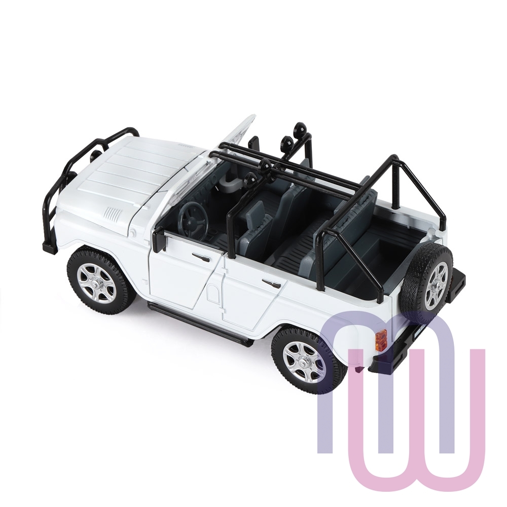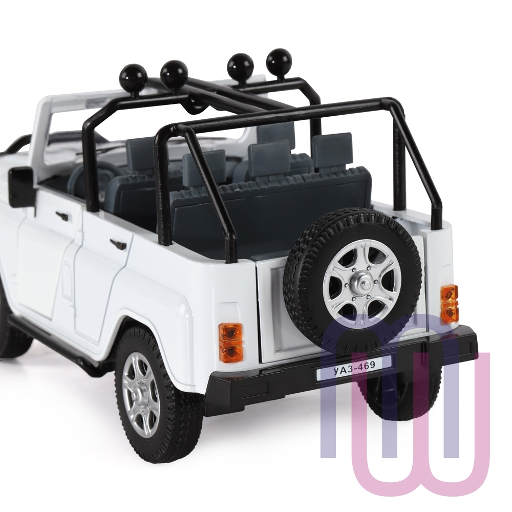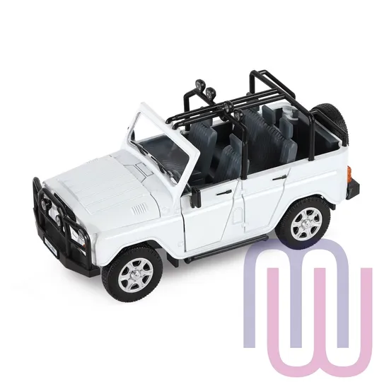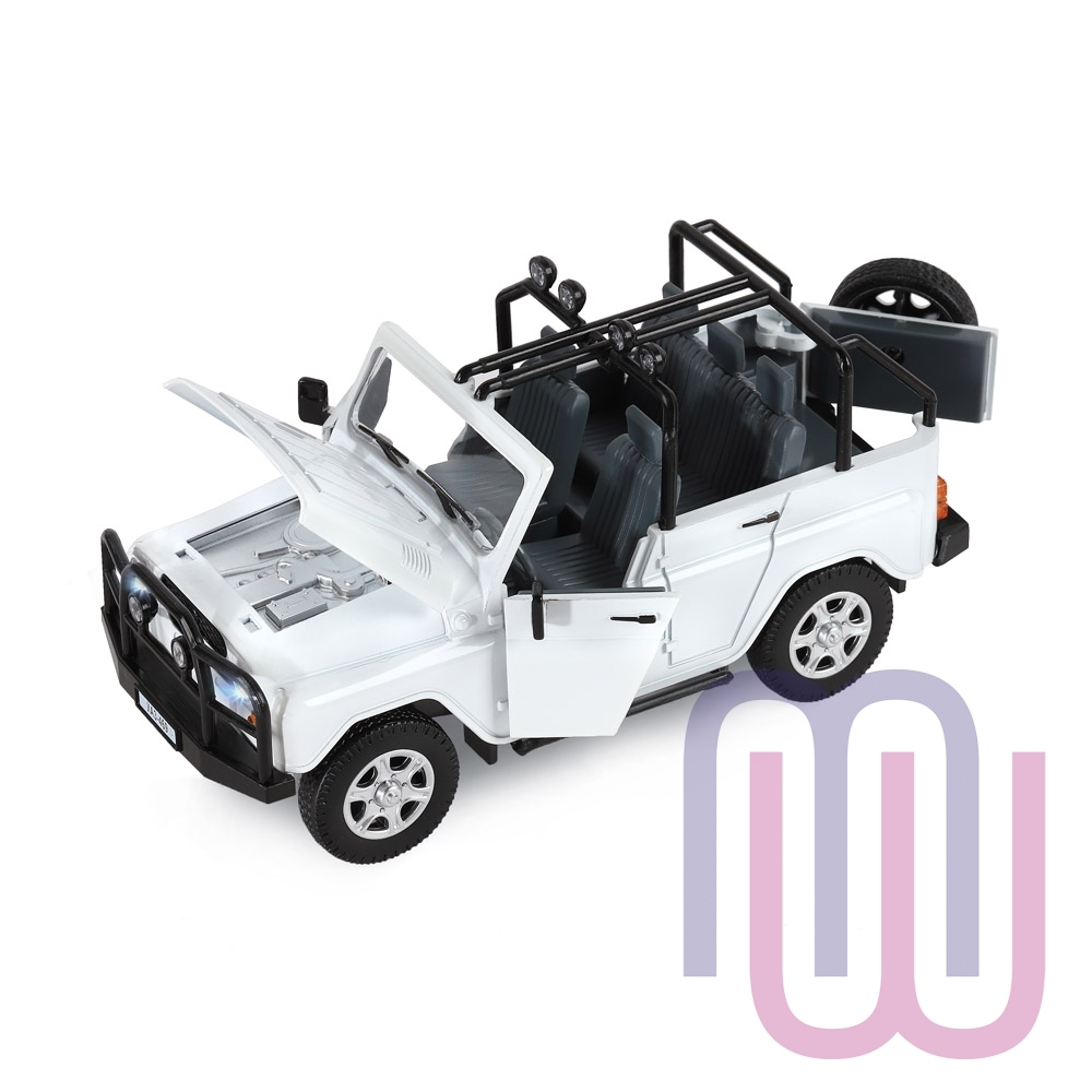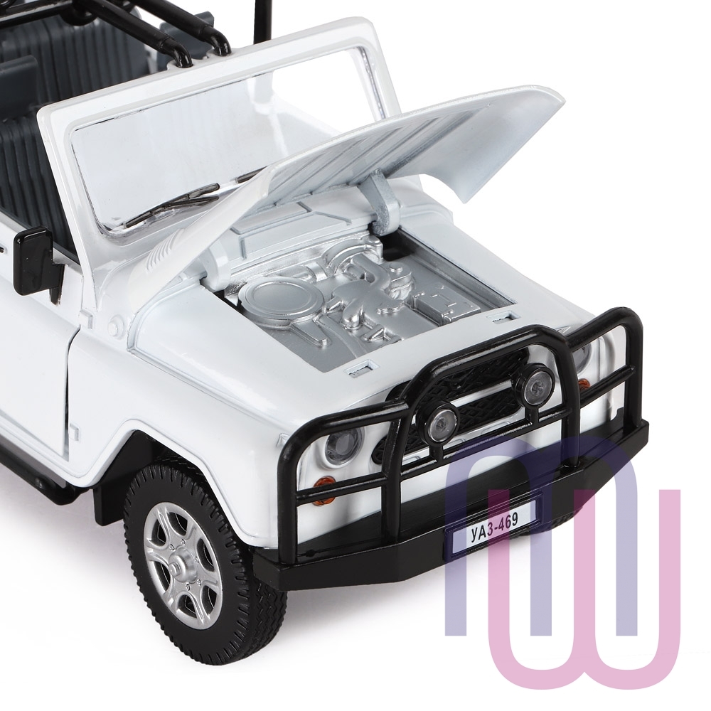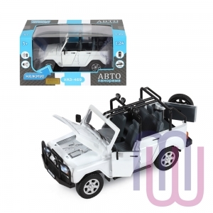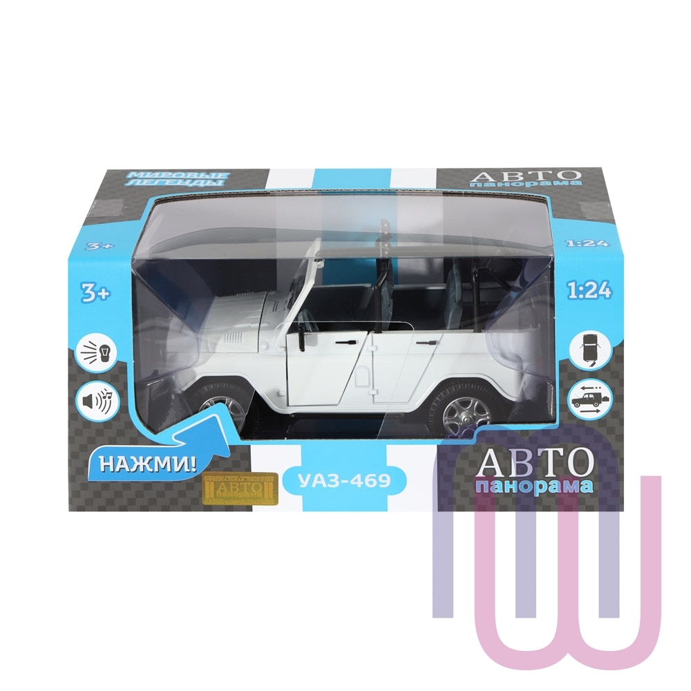 Металлическая лицензионная машинка УАЗ-469 - уменьшенная копия известного внедорожника, который можно эксплуатировать практически в любых условиях.Машинка прекрасно дополнит игрушечный автопарк и сделает игру более увлекательной.Модель машинки детально проработана и имеет узнаваемый дизайн кузова легендарного ""Уазика"". Ей покорится любое бездорожье, любое ралли.Модель выполнена в масштабе 1:24, у нее открываются передние двери, капот и дверки на кузове. Если откатить автомобиль немного назад и отпустить, он поедет вперед.При нажатии на корпус включается звук мотора и загораются фары, при открытии дверей включается звук сигнализации и загораются фары.Ребенок будет с удовольствием катать такую машинку дома и на улице. Игрушка развивает скорость реакции, мелкую моторику, пробуждает интерес к технике.Автомобиль также может быть интересен взрослым коллекционерам.