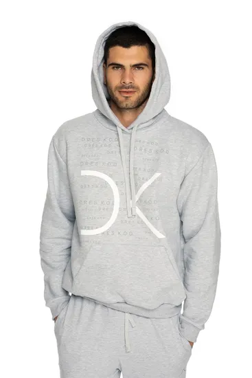 Худи с капюшоном DK10 Words 03 серого цвета. Модель свободного кроя с длинными рукавами. Спереди накладной карман и печатный логотип DK с слегка прорезиненной структурой, на заднем плане расположены различного размера надписи «DRES KOD». Худи выполнено из плотной ткани с начесом.