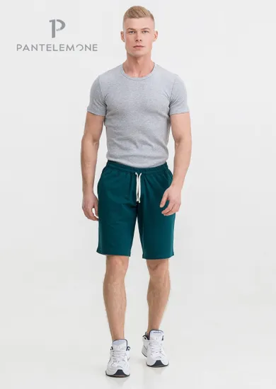 Мужские шорты среднего объема, карманы наклонные, пояс цельно кроенный с резинкой и шнуром. На левой задней правой детали карман с молнией.