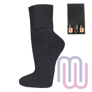 Носки с электрическим подогревом RedLaika RL-N-03 (AA) работают от обычных пальчиковых батареек или аккумуляторов АА (3 шт в каждом носке). Элементы питания устанавливаются в небольшой пластиковый корпус, который помещается в специальный кармашек в верхней части носка на внешней стороне голени. Носки на батарейках изготавливаются из натурального хлопка с добавлением волокон спандекса. Это позволяет сохранить мягкость хлопковой ткани и сделать её более эластичной, прочной и устойчивой к истиранию. Носки хорошо сохраняют форму, пропускают воздух и практически не теряют цвет во время стирки. За поддержание нужной температуры отвечают инфракрасные пластины, расположенные в центральной части стопы. Они могут нагреваться до +60 °C. От пластин отходит провод, при помощи которого модули соединяются с блоком питания. Провод вшит в ткань и не создаёт никаких неудобств во время ходьбы. Блок питания вставляется в специальный кармашек около резинки. Он рассчитан на 3 батарейки типа AA. На верхней стороне блока находится переключатель и индикатор работы устройства. У каждого носка свой блок питания. Одного комплекта батареек хватает на 4 часа непрерывной работы. Носки RedLaika RL-N-03 подходят для людей с размером обуви от 36 до 46. Длина стопы - 20 см, максимальное растяжение - 33 см. Высота носков от пятки 30 см.