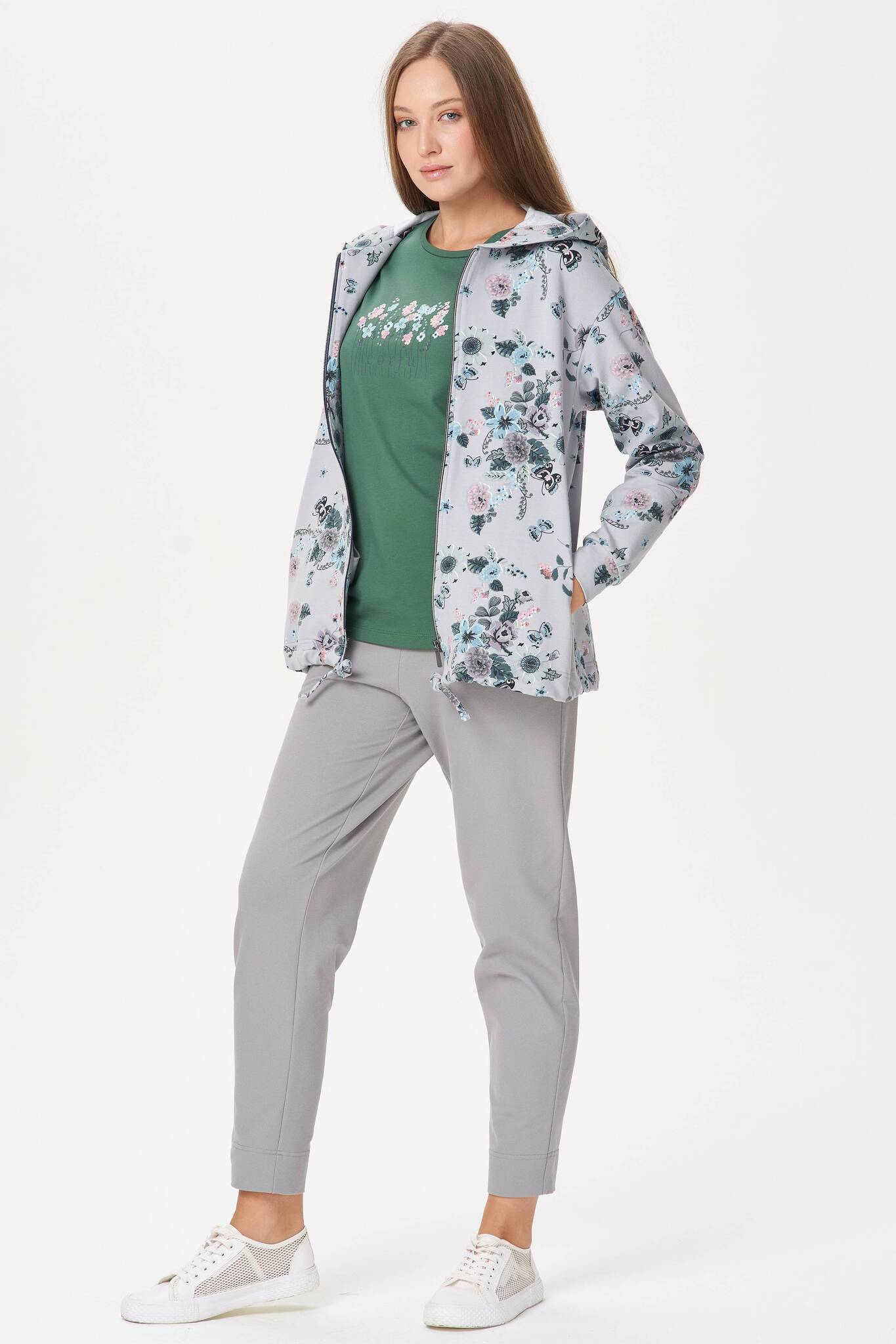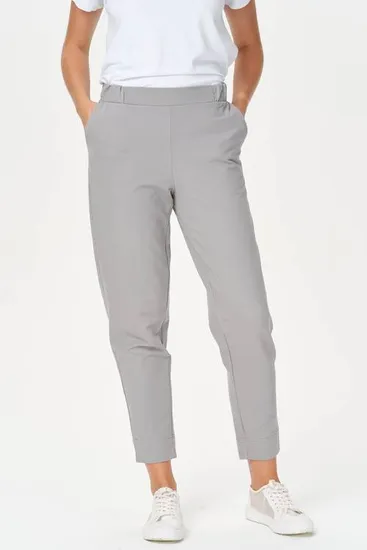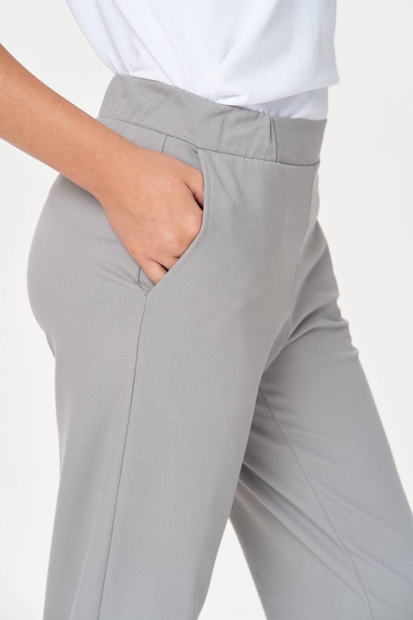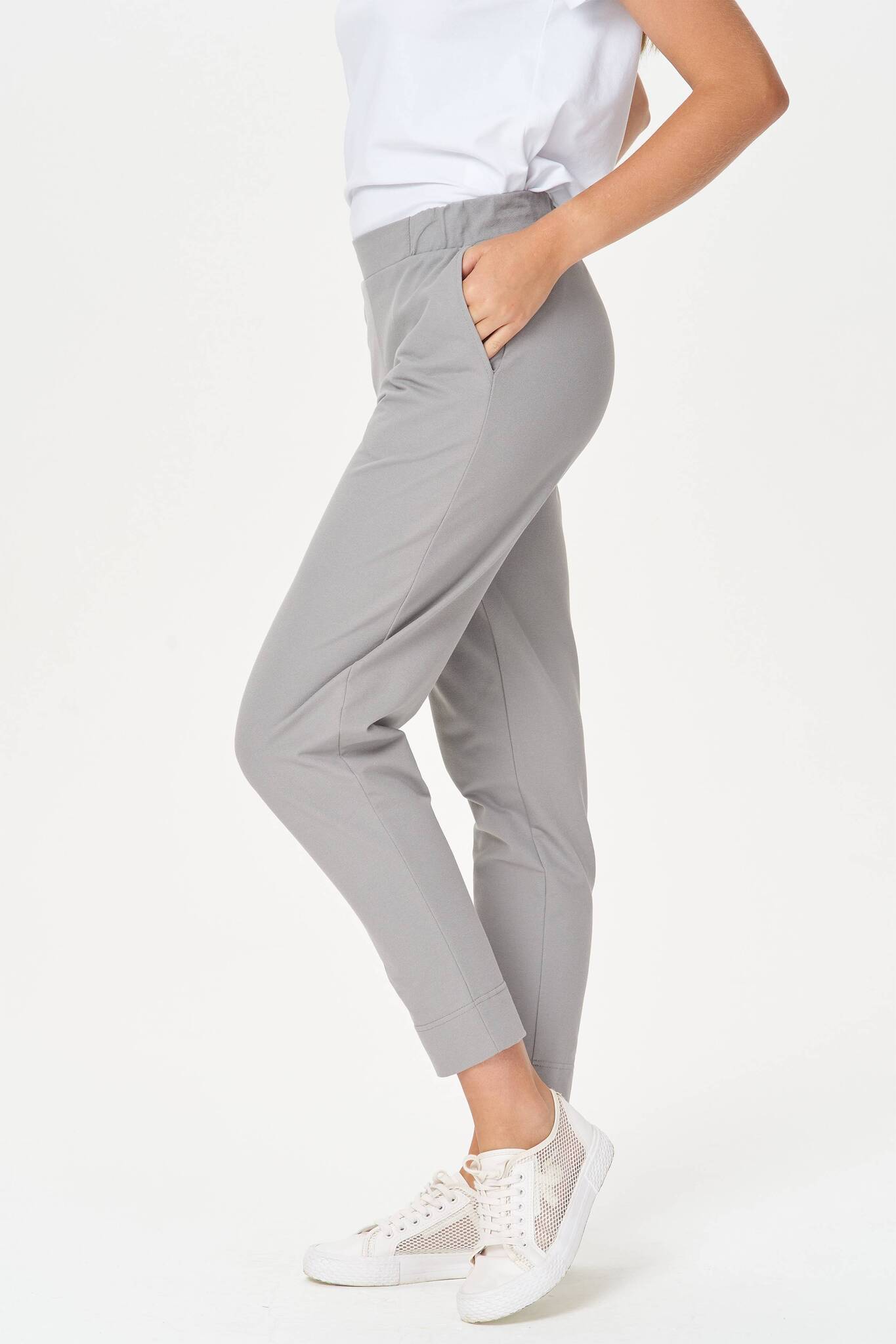 Комфортные брюки с карманами, из хлопкового полотна джинскотт. Пояс с планкой и эластичной тесьмой внутри. По низу брюк отвороты. Рост модели на фото 175.