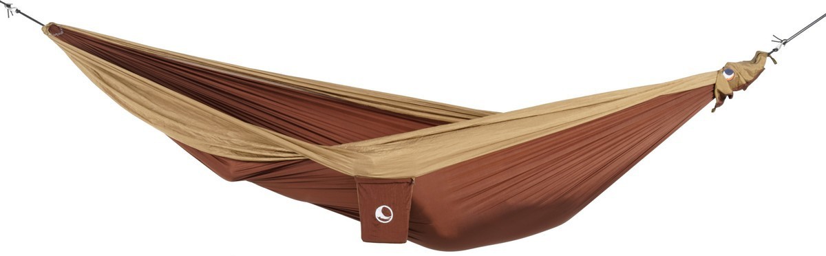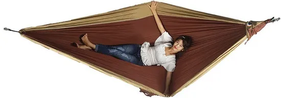 Одноместный туристический гамак из легкого и прочного парашютного шелка. Тканевый походный гамак упакован в компактный чехольчик в виде луны или полумесяца, который можно прикрепить к туристическому рюкзаку. При использовании гамака совместно с тентом и москитной сеткой можно получить легкую палатку-гамак весом около 1,5 кл и объемом 3 л.