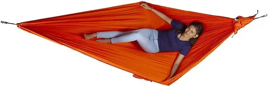 Одноместный туристический гамак из легкого и прочного парашютного шелка. Тканевый походный гамак упакован в компактный чехольчик в виде луны или полумесяца, который можно прикрепить к туристическому рюкзаку. При использовании гамака совместно с тентом и москитной сеткой можно получить легкую палатку-гамак весом около 1,5 кл и объемом 3 л.