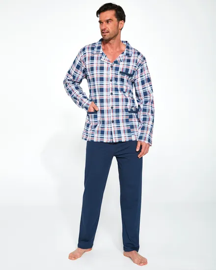 Классическая мужская пижама состоящая из рубашки в клетку на пуговицах с V-образным вырезом и однотонных брюк свободного кроя с эластичной незажимающей резинкой в поясе. На рубашке два боковых кармана и один нагрудный. Пижама выполнена из высококачественного хлопка.