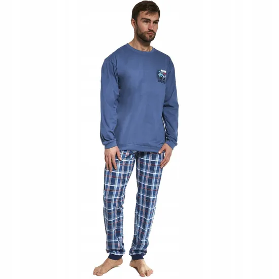Пижама выполнена из высококачественного натурального хлопка, джинсового цвета, состоит из реглана и прямых брюк в крупную клетку. Реглан с круглым вырезом горла и с длинными рукавами, брюки на мягкой резинке в поясе. Круглый вырез, рукава, низ реглана и брюк на манжетах синего цвета, вверху небольшой принт с надписями. Пижама очень комфортная и удобная, будет замечательным подарком для любимого и близкого человека.
