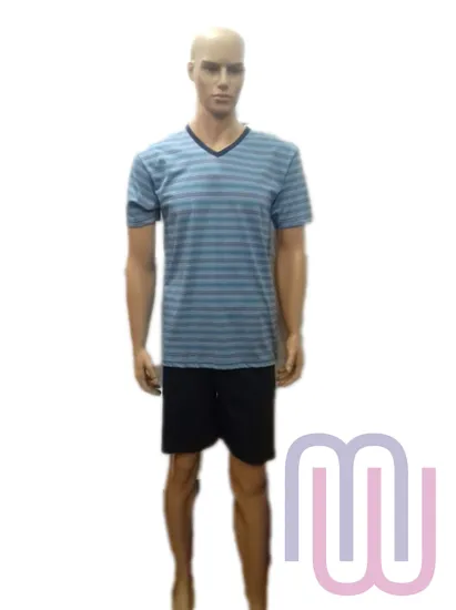 Оригинальная мужская пижама от ТМ Cornette. Пижама состоит из светлой футболки в разноцветную полоску с коротким рукавом и свободных однотонных шорт. V-образный вырез горловины обработан трикотажной резинкой в тон шорт. Ткань - трикотаж из высококачественного натурального хлопка.