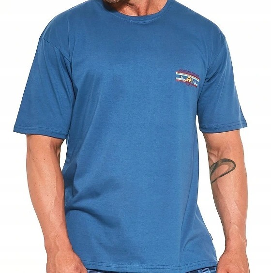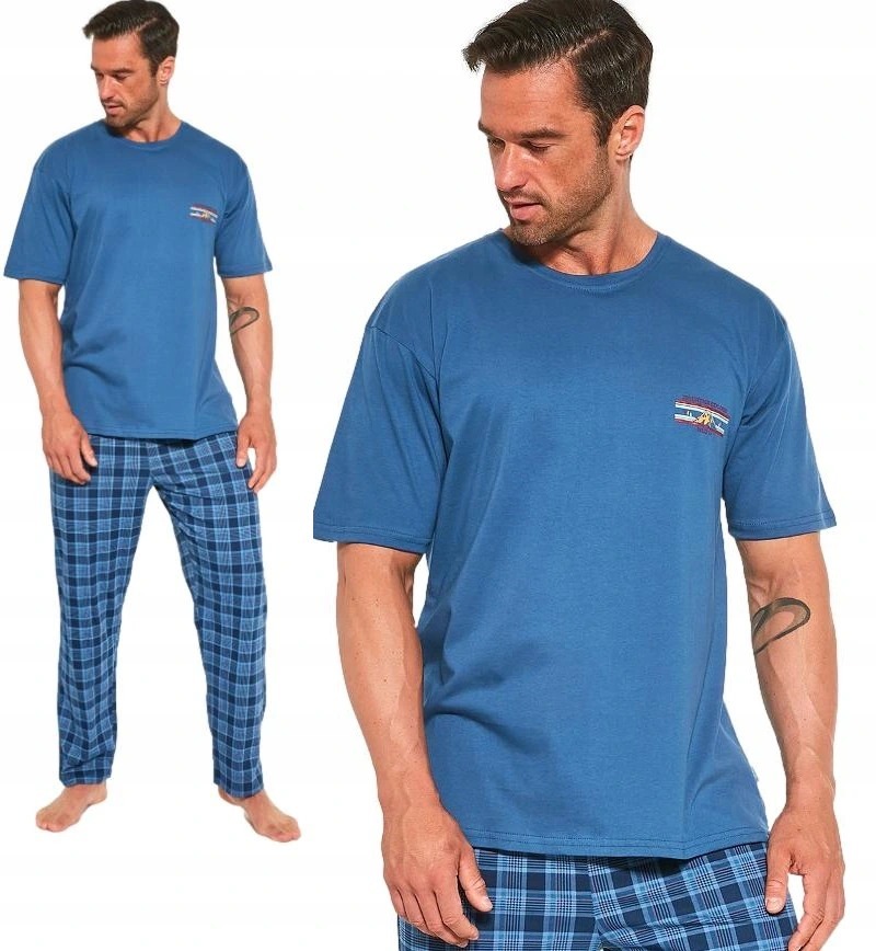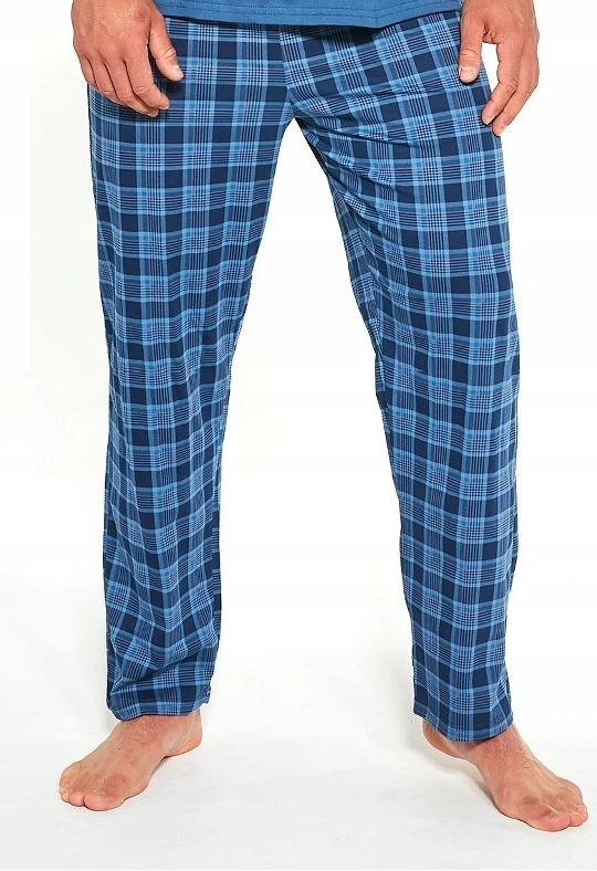 Мужская пижама из хлопка 134/180 Cornette. Комфортная мужская пижама из качественного и мягкого натурального хлопка. В комплект входит однотонная футболка с коротким рукавом и прямые свободные брюки на мягкой резинке в поясе. Футболка украшена принтом на передней полочке, штаны в клетку по всему полотну.