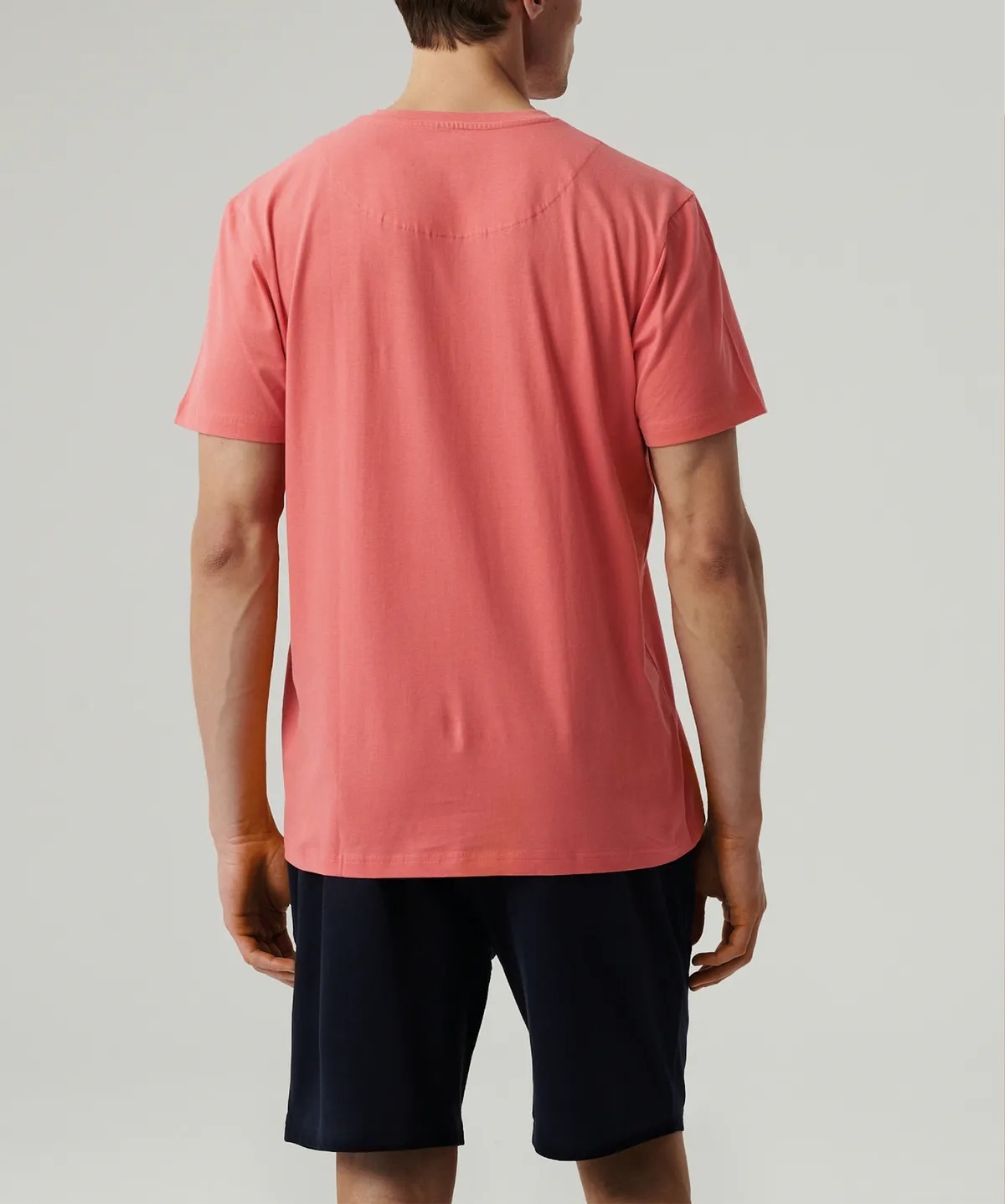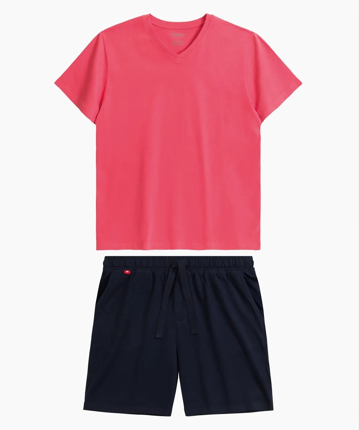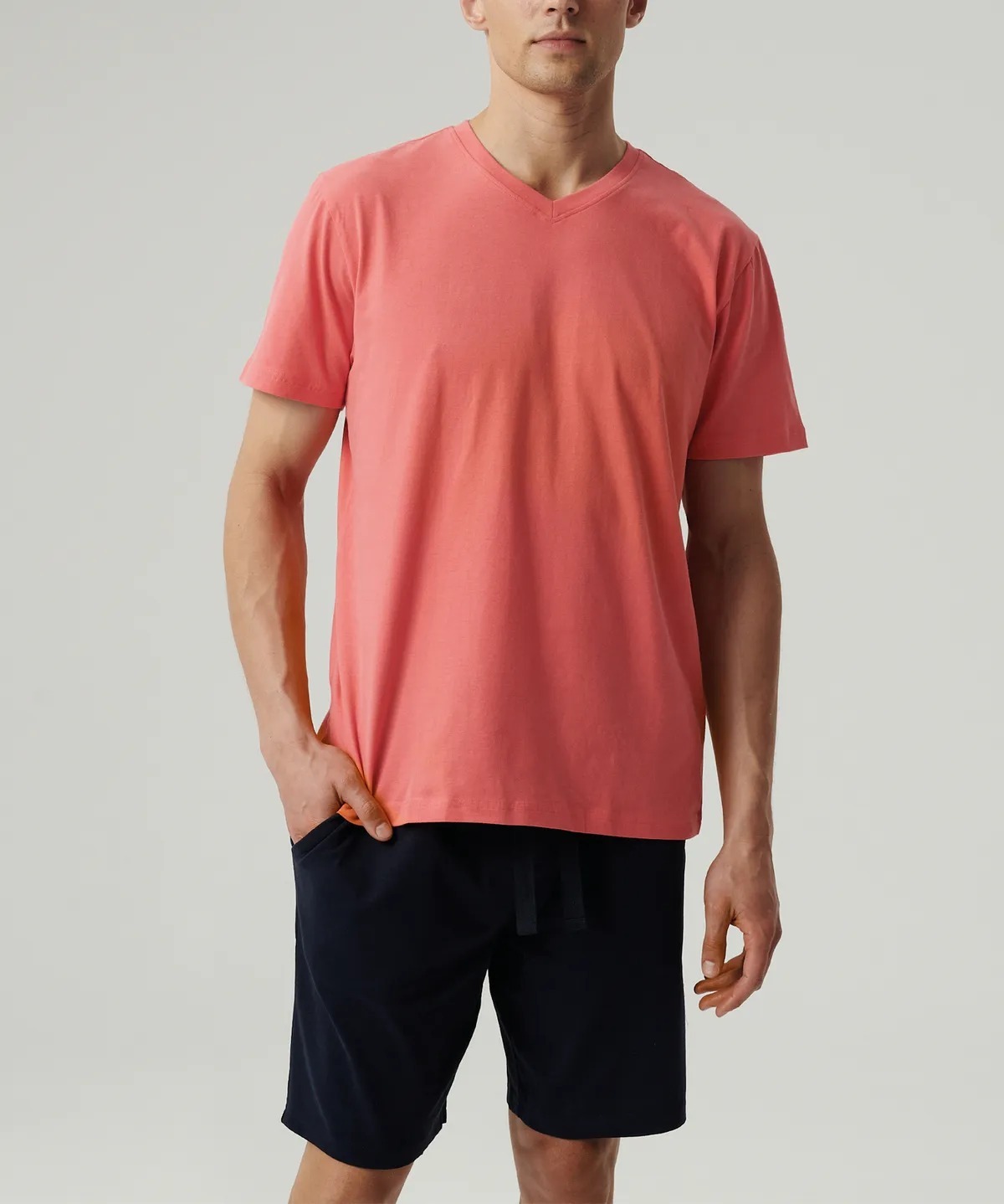 Мужская пижама Atlantic NMP-379E кораллового и темно-синего цветов из коллекции Homewear - стильный комплект из футболки и шорт для комфортного отдыха и повседневной носки. Комплект изготовлен из 100% хлопка с технологией "вычесывания" хлопка для повышенной прочности и эффектом "Peach Effect", создающим бархатистую поверхность для максимального комфорта. Шорты с классическим кроем дополнены эластичным поясом на завязках и боковыми карманами, футболка с V-образным вырезом легко сочетается с джинсами или спортивной одеждой. Доступны в различных расцветках: изумрудная футболка с темно-синими шортами, голубая с графитовыми, коралловая с темно-синими. Натуральный хлопок обеспечивает воздухопроницаемость, отличное влагопоглощение и сохранение формы после стирок. Размерная сетка от S до 4XL, стильная упаковка делает комплект идеальным подарком для мужчин любого возраста.