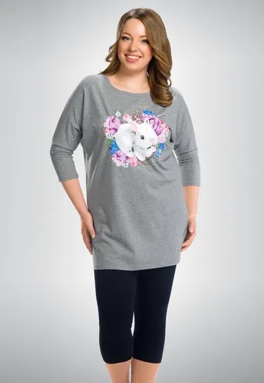 Домашняя одежда должна быть удобной и комфортной. Крой туники выполнен таким образом, что вы не будете чувствовать никакого дискомфорта, а милый кролик только дополняет чувство теплоты и уюта. В комплекте трикотажные бриджи.
