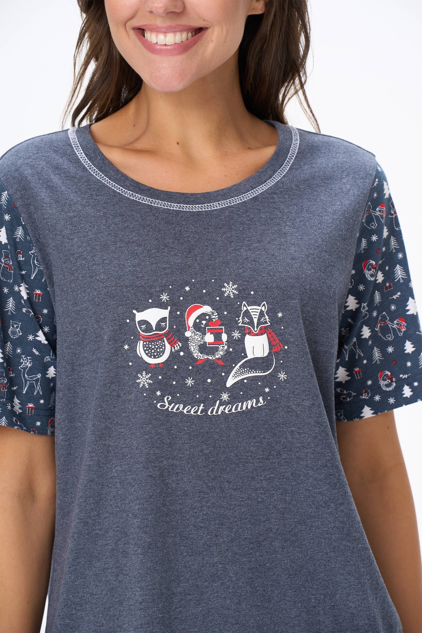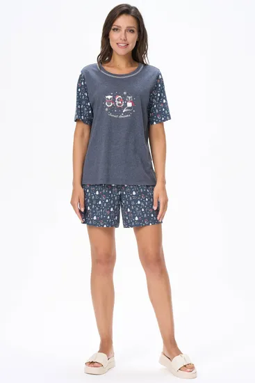 Пижама - футболка и шорты. Футболка выполненна из сочетания хлопкового и меланжевого трикотажных полотен, свободного силуэта с круглым вырезом горловины и яркий принтом. Прямые шорты с карманами, пояс с эластичной тесьмой внутри. Отделка - канты и контрастная строчка - в цвет принта. Рост модели на фото 170см. Цвет: серый Состав: 70% хлопок, 30% полиэстер