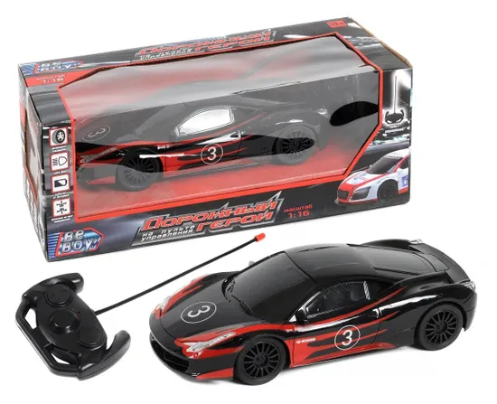 Машинка на радиоуправлении BeBoy работает от батареек, в комплекте пульт управления. Движение вперед – назад, влево – вправо. Резиновые покрышки. Свет фар. М 1:16.
