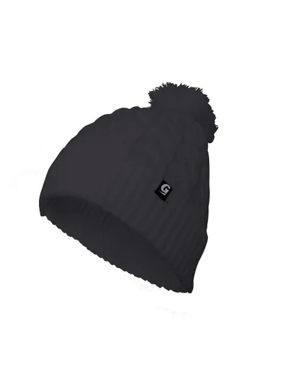 Удлиненная шапка с отворотом и помпоном, декорирована вязаным узором в форме косичек. Отлично подойдет для прогулок в прохладную погоду.
