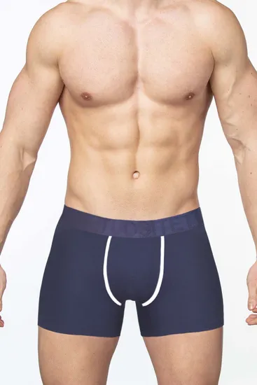 Трусы из высококачественного плотного, однотонного хлопка с добавлением эластана. Резинка синего цвета шириной 3 см пришита накладным тройным швом. Внешняя и внутренняя сторона пояса украшена логотипом бренда, внутреняя сторона стыковочного шва закрыта атласной лентой с логотипом бренда. Гульфик из двойной ткани украшен окантовкой белого цвета, вшита ластовица, боковые швы отсутствуют.