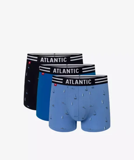 Набор из 3 шт. мужских трусов-шорт Atlantic светло-голубого, бирюзового и темно-синего цвета. Мужские трусы-шорты 3MH-039 от польского бренда Atlantic на каждый день: превосходно подойдут абсолютно любому мужчине как для повседневной носки, так и для активного занятия спортом (например, бега, фитнеса, физических или силовых нагрузок). Анатомически выверенный спортивный крой этой модели гарантирует идеальную посадку по фигуре и максимальный комфорт. Внешняя пришивная резинка не давит, не скручивается и не натирает при носке. Облегающие мужские трусы шорты имеют среднюю линию талии, штанины стандартной длины и профилированный гульфик, поэтому могут подойти к любому типу одежды. В составе используется мягкий, приятный на ощупь хлопок в сочетании с эластаном. Трикотажное хлопковое полотно является прочным материалом, устойчивым к высоким температурам и растяжению, благодаря чему нижнее белье надолго сохраняет свой внешний вид и потребительские свойства. В упаковке представлено трое шорт в различных вариантах расцветок - две модели выполнены с контрастным графическим принтом в виде кораблей и парусников, одна модель исполнена в однотонной цветовой гамме. Брендированная резинка из микрофибры обеспечивает приятные тактильные ощущения для кожи. Нижнее белье Атлантик будет превосходным подарком для мужчин всех возрастов: молодым парням и подросткам подойдут модели нижнего белья в яркой цветовой гамме и с паттерном или рисунком, более взрослым мужчинам - нижнее белье в сдержанных или строгих цветах, хотя иногда можно нарушить правила и поэкспериментировать.