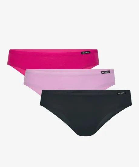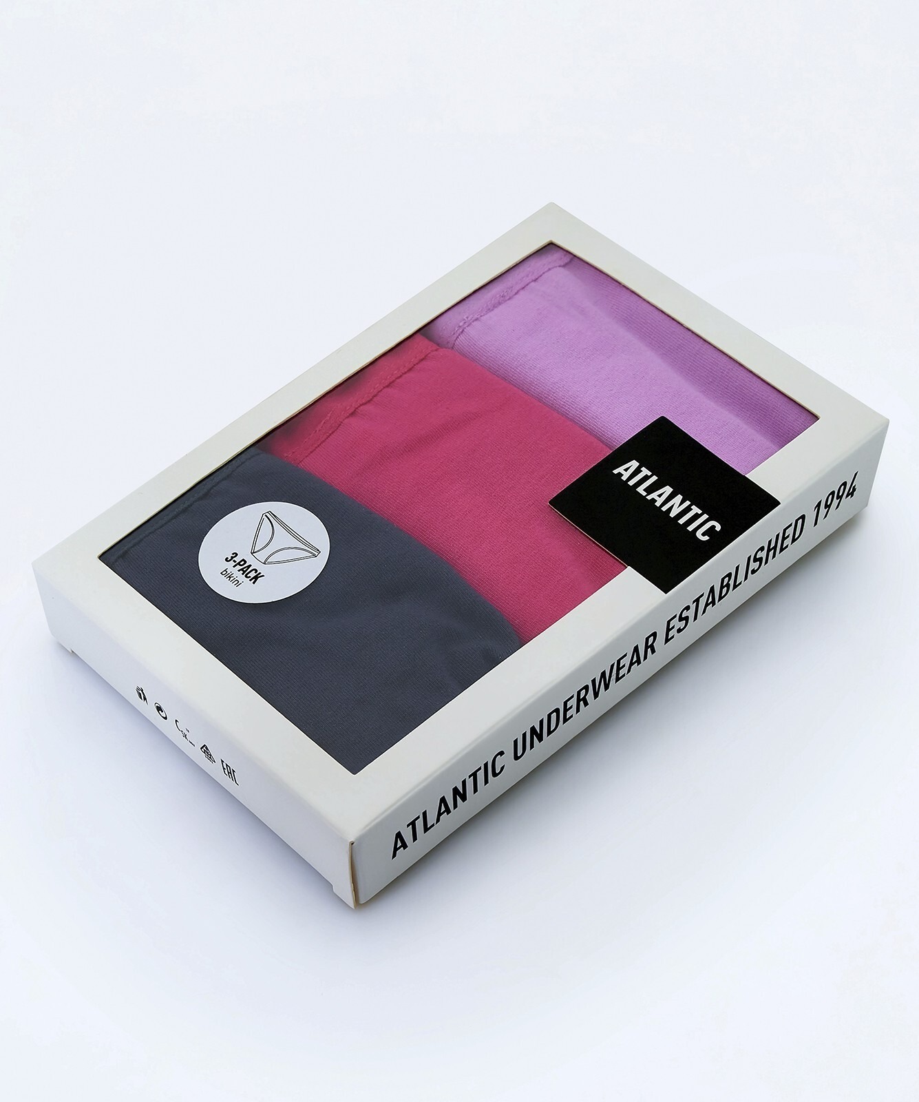 Набор из 3 шт. женских трусов-слипов Atlantic цвета графит, розового и светло-фиолетового цвета. Классические однотонные женские трусы слипы 3LP-194 от польского бренда Atlantic на каждый день: превосходно подойдут абсолютно любой женщине как для повседневной носки, так и для активного занятия спортом (например, фитнеса, бега, аэробики или йоги). Крой этой модели гарантирует идеальную посадку по фигуре и максимальный комфорт. Тонкая резинка в поясе и по ножке не давит, не натирает и не скатывается при носке, а также обеспечивает контакт только с натуральным материалом. Облегающие женские трусы бикини имеют заниженную линию талии и универсальную ширину по бокам, поэтому могут подойти к любому типу одежды. В составе используется мягкий, приятный на ощупь хлопок в сочетании с эластаном. Трикотажное хлопковое полотно является прочным материалом, устойчивым к высоким температурам и растяжению, благодаря чему нижнее белье надолго сохраняет свой внешний вид и потребительские свойства. В упаковке представлено трое трусов бикини в разных расцветках. Нижнее белье Атлантик будет превосходным подарком для представительниц прекрасного пола: молодым девушкам подойдут модели нижнего белья в яркой цветовой гамме и с паттерном или рисунком, более взрослым женщинам - нижнее белье в сдержанных или строгих цветах, хотя иногда можно нарушить правила и поэкспериментировать.