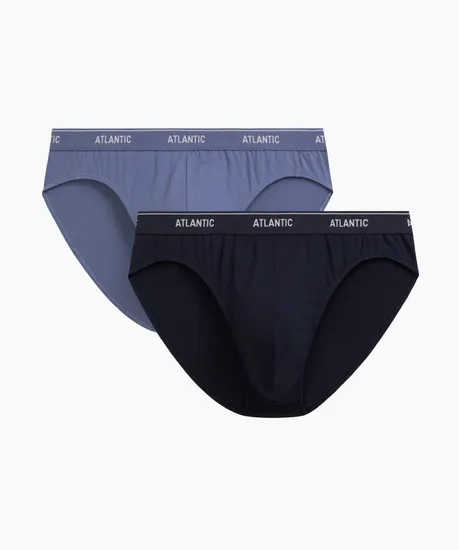 Набор из 2 шт. мужских трусов-слипов деним и тёмно-синего цвета. Мужские классические однотонные трусы-слипы 2RMP-001 от польского бренда Atlantic на каждый день: превосходно подойдут абсолютно любому мужчине как для повседневной носки, так и для активного занятия спортом (например, бега, фитнеса или физических нагрузок). Анатомически выверенный крой этой модели гарантирует идеальную посадку по фигуре и максимальный комфорт. Внешняя пришивная резинка не давит, не скручивается и не натирает при носке. Облегающие мужские трусы слипы имеют слегка заниженную линию талии и универсальную ширину по бокам, поэтому могут подойти к любому типу одежды. В составе используется мягкий, приятный на ощупь хлопок в сочетании с эластаном. Трикотажное хлопковое полотно является прочным материалом, устойчивым к высоким температурам и растяжению, благодаря чему нижнее белье надолго сохраняет свой внешний вид и потребительские свойства. Брендированная резинка из микрофибры обеспечивает приятные тактильные ощущения для кожи. Нижнее белье Атлантик будет превосходным подарком для мужчин всех возрастов.