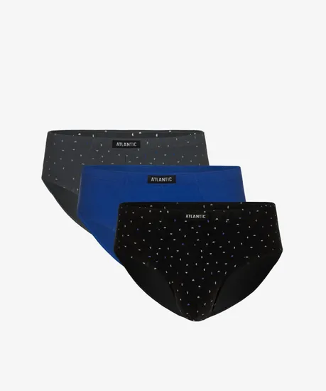 Набор из 3 шт. мужских трусов-слипов Atlantic цвета графит, голубого и черного цвета. Классические мужские трусы-слипы 3MP-142 от польского бренда Atlantic на каждый день: превосходно подойдут абсолютно любому мужчине как для повседневной носки, так и для активного занятия спортом (например, бега или фитнеса). Анатомический крой этой модели гарантирует идеальную посадку по фигуре и максимальный комфорт. Скрытая туннельная резинка не давит и не натирает при носке, а также обеспечивает контакт только с натуральным материалом. Облегающие мужские трусы слипы имеют достаточно высокую линию талии и широкую боковую часть, поэтому могут подойти к любому типу одежды. В составе используется мягкий, приятный на ощупь 100% хлопок. Трикотажное хлопковое полотно является прочным материалом, устойчивым к высоким температурам и растяжению, благодаря чему нижнее белье надолго сохраняет свой внешний вид и потребительские свойства. В упаковке представлено трое трусов брифов в различных вариантах расцветок: одна модель выполнена в однотонном цвете, две другие представлены с контрастным мелким графическим принтом в классическом стиле, выполненном в виде маленьких полусфер. Нижнее белье Атлантик будет превосходным подарком для мужчин всех возрастов: молодым парням и подросткам подойдут модели нижнего белья в яркой цветовой гамме и с паттерном или рисунком, более взрослым мужчинам - нижнее белье в сдержанных или строгих цветах, хотя иногда можно нарушить правила и поэкспериментировать. Кроме того, в нашем интернет-магазине Вы сможете приобрести трусы слипы Атлантик 3MP-142 из наличия по самым выгодным ценам. Широкая размерная сетка с самыми популярными (от S до XXL) и большими (3XL, 4XL) размерами, а также стильная фирменная упаковка нашего нижнего белья помогут однозначно сделать Вам верный выбор!