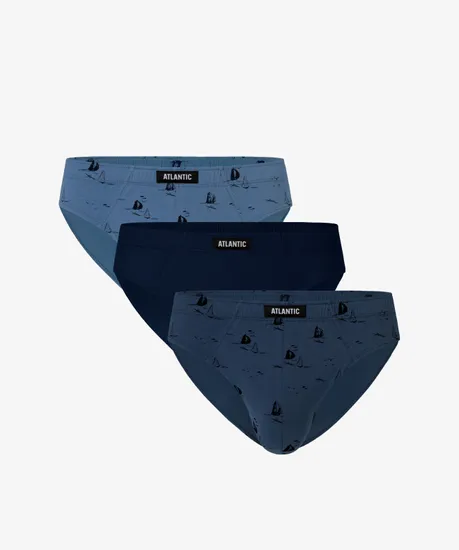 Набор из 3 шт. мужских трусов-слипов Atlantic голубого, темно-синего и темно-голубого цвета. Классические мужские трусы-слипы 3MP-130 от польского бренда Atlantic на каждый день: превосходно подойдут абсолютно любому мужчине как для повседневной носки, так и для активного занятия спортом (например, бега или фитнеса). Анатомический крой этой модели гарантирует идеальную посадку по фигуре и максимальный комфорт. Скрытая туннельная резинка не давит и не натирает при носке, а также обеспечивает контакт только с натуральным материалом. Облегающие мужские трусы слипы имеют слегка заниженную линию талии и универсальную ширину по бокам, поэтому могут подойти к любому типу одежды. В составе используется мягкий, приятный на ощупь хлопок в сочетании с эластаном. Трикотажное хлопковое полотно является прочным материалом, устойчивым к высоким температурам и растяжению, благодаря чему нижнее белье надолго сохраняет свой внешний вид и потребительские свойства. В упаковке представлено трое трусов брифов в следующих расцветках: однотонный темно-синий, голубой и темно-голубой с контрастным мелким принтом в виде кораблей. Нижнее белье Атлантик будет превосходным подарком для мужчин всех возрастов: молодым парням и подросткам подойдут модели нижнего белья в яркой цветовой гамме и с паттерном или рисунком, более взрослым мужчинам - нижнее белье в сдержанных или строгих цветах, хотя иногда можно нарушить правила и поэкспериментировать.